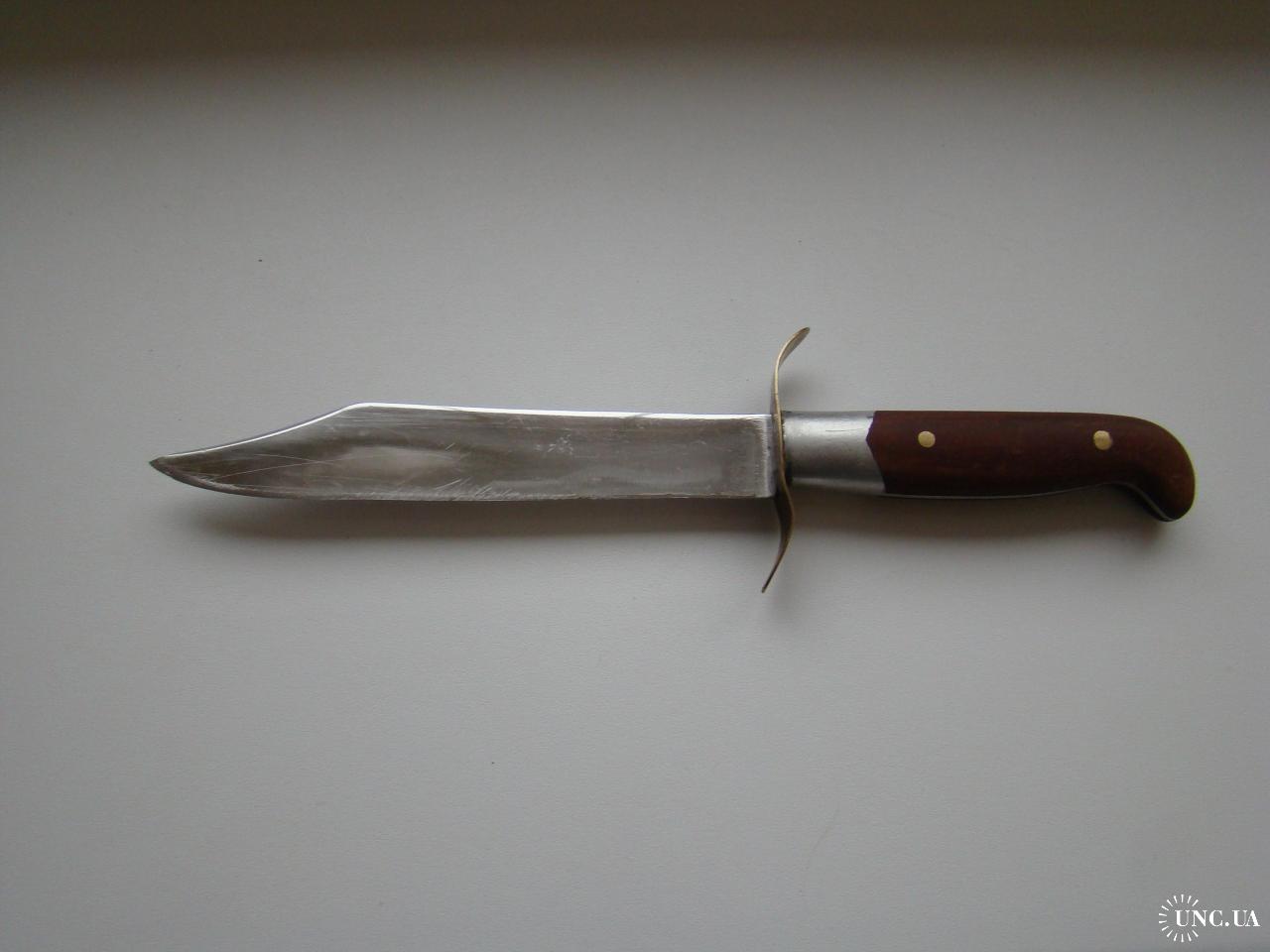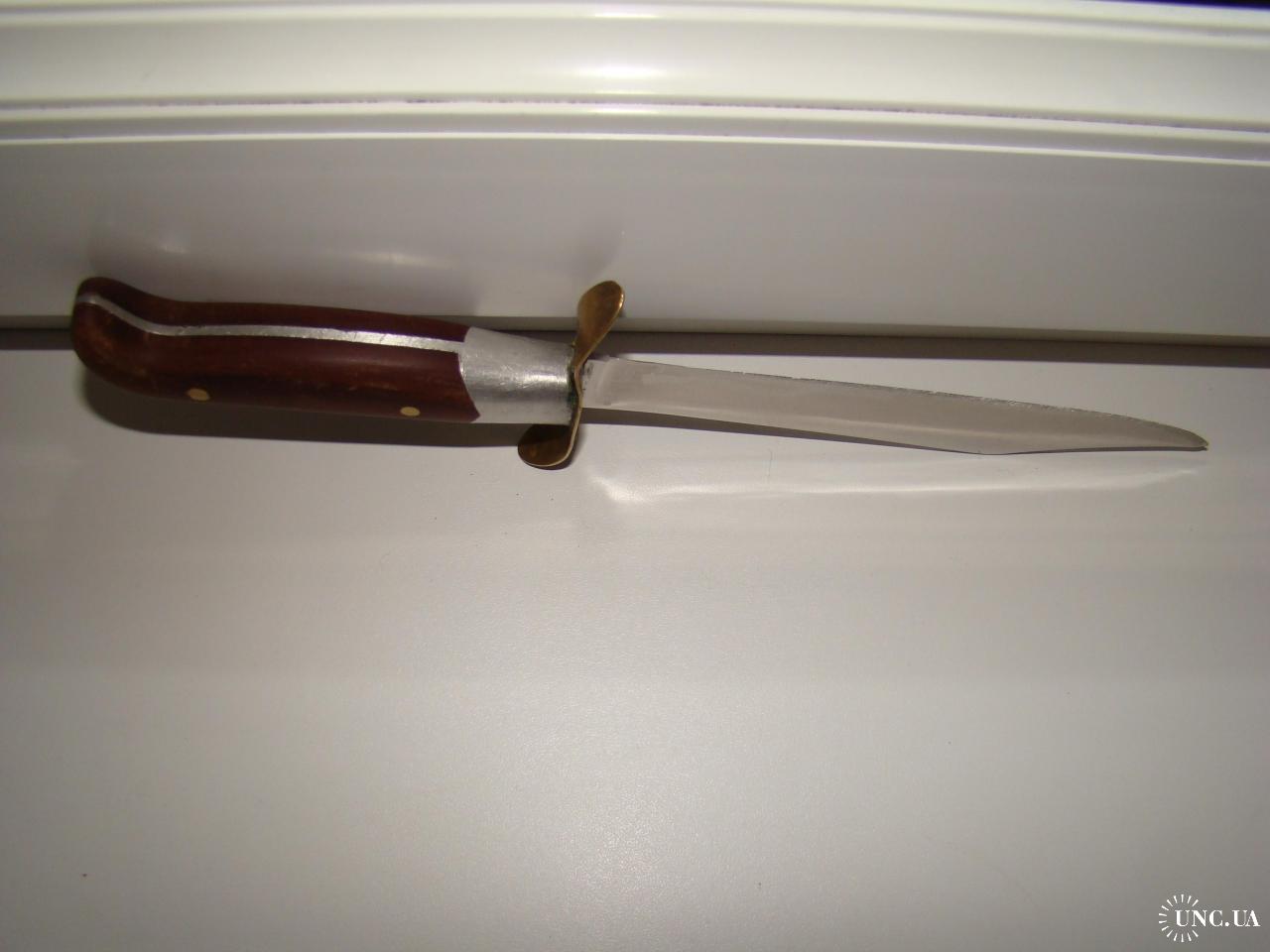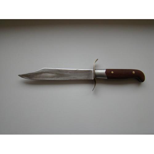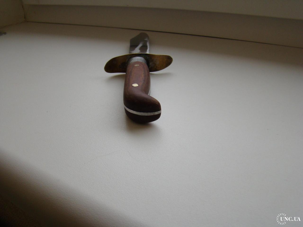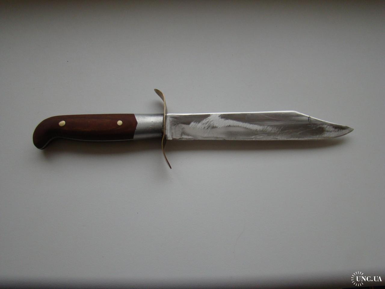 Длина ножа 25,5 см. Рукоять изготовлена из алюминия и эбонита, заклепки латунные или медные. Гарда латунная, лезвие из нержавеющей стали. В хорошем состоянии, но нуждается в полировке лезвия. В остальном все как на фото.