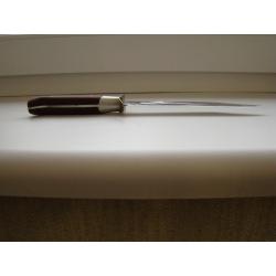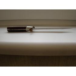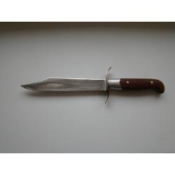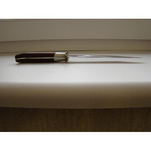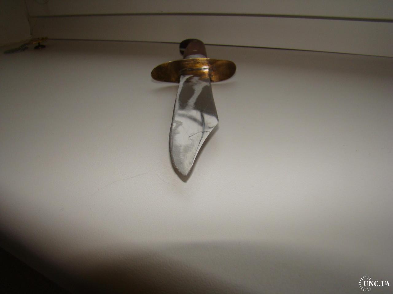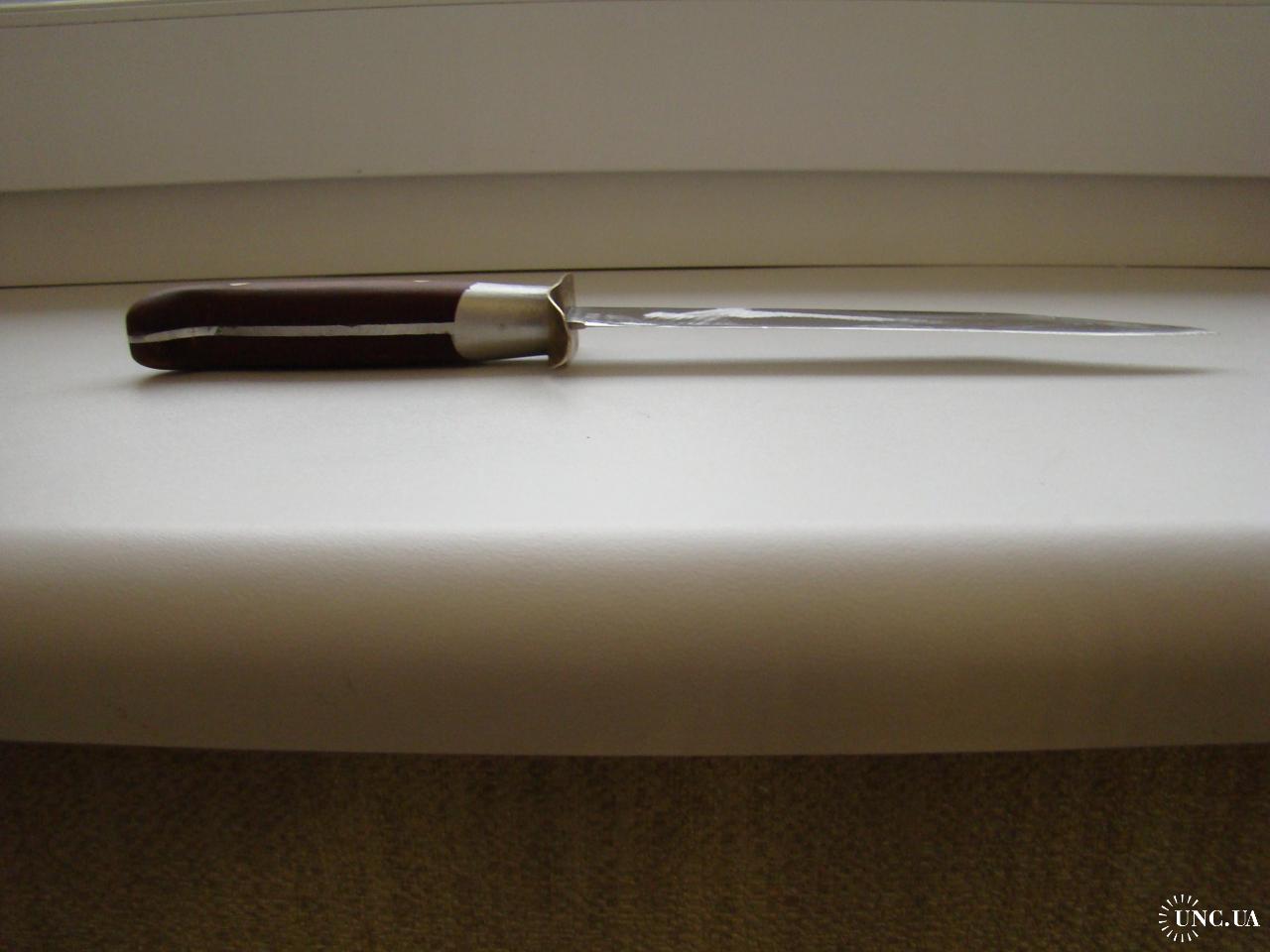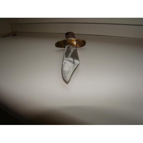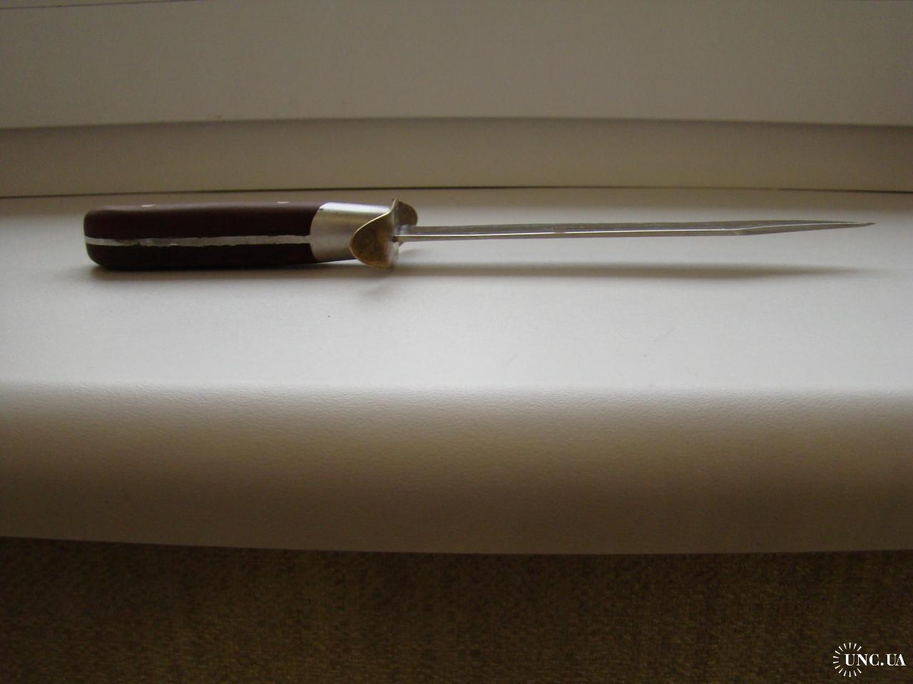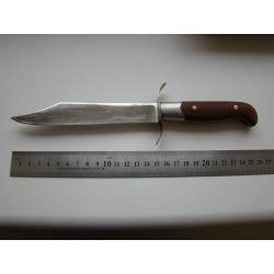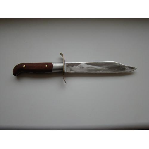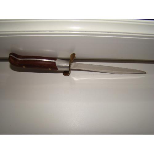 Длина ножа 25,5 см. Рукоять изготовлена из алюминия и эбонита, заклепки латунные или медные. Гарда латунная, лезвие из нержавеющей стали. В хорошем состоянии, но нуждается в полировке лезвия. В остальном все как на фото.