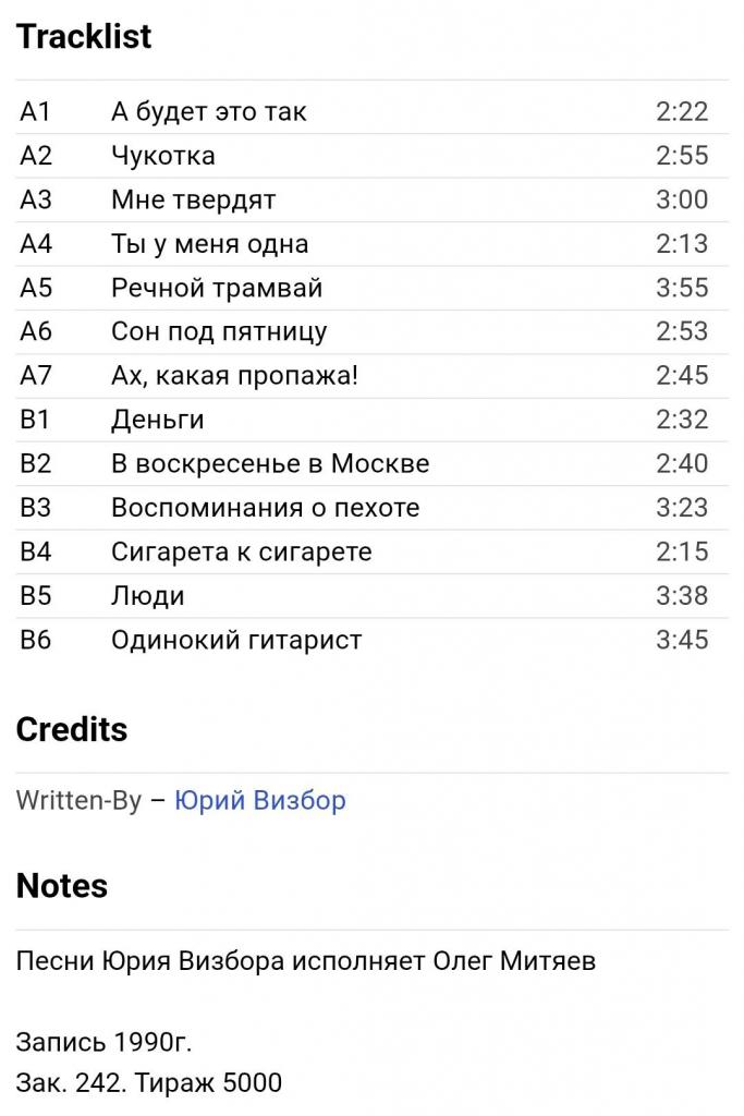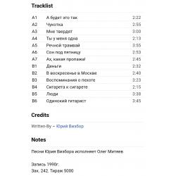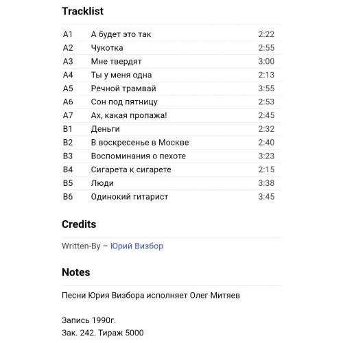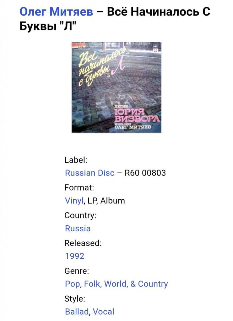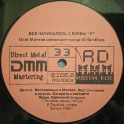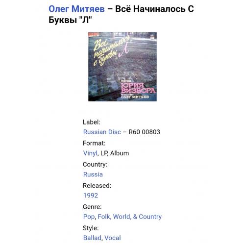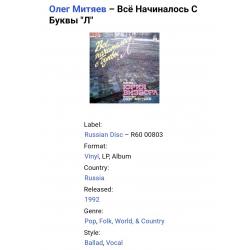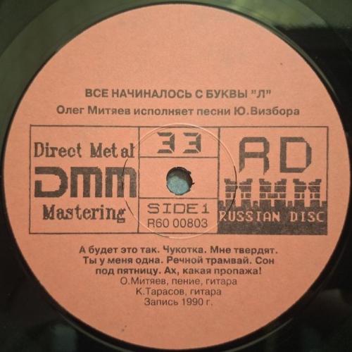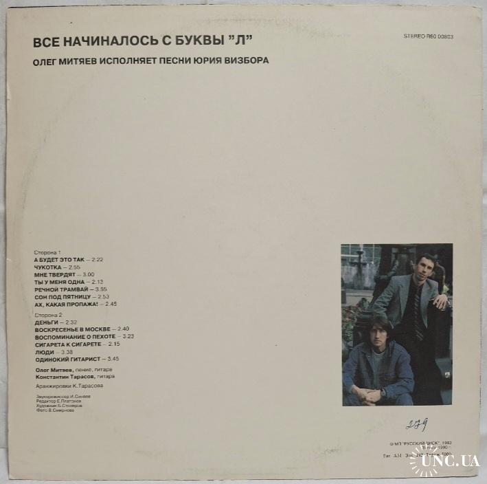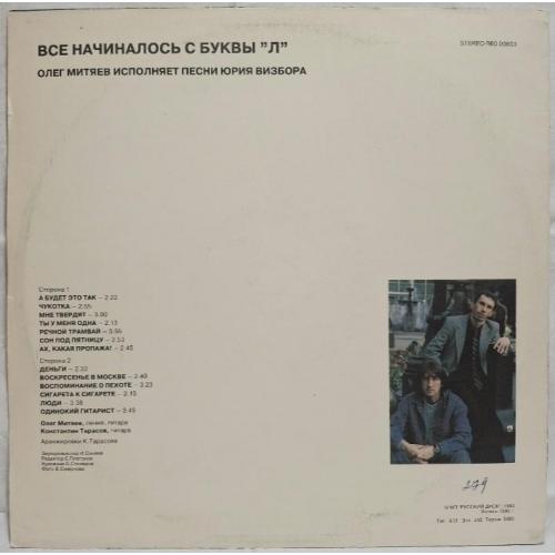 Вінілова платівка. Другий, в дискографії, студійний альбом, російського (радянського) барда, виконавця авторської пісні Олега Мітяєва (Все Начиналось с Буквы Л. Песни Юрия Визбор) 1992. Випуск фірми (Russian Disc) Russia, 1992-ий рік. Оригінальне, рідне, першопресове, видання. Лімітований тираж (Limited Edition). Рідкісне (Rare). Стан платівки NM-/EX+. Стан конверту ЕХ+. Відправка по Україні службами доставки: Нова Пошта, Укр Пошта, Делівері. Також відправляємо посилки за кордон по цілому світу.