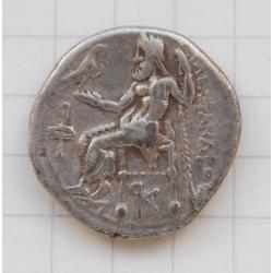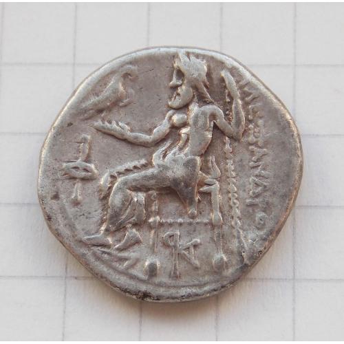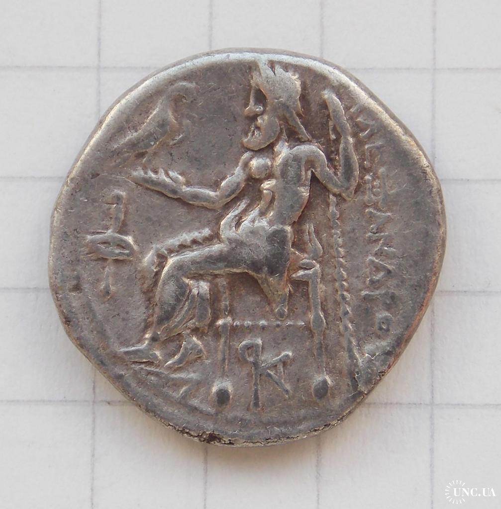 Реверс: AΛEΞANΔPOY.Зевс сидить ліворуч, тримає скіпетр. ΑΛEΞANΔPOY праворуч, Φ ліворуч, монограма під троном.