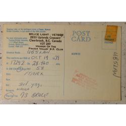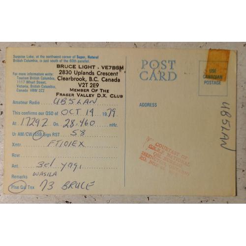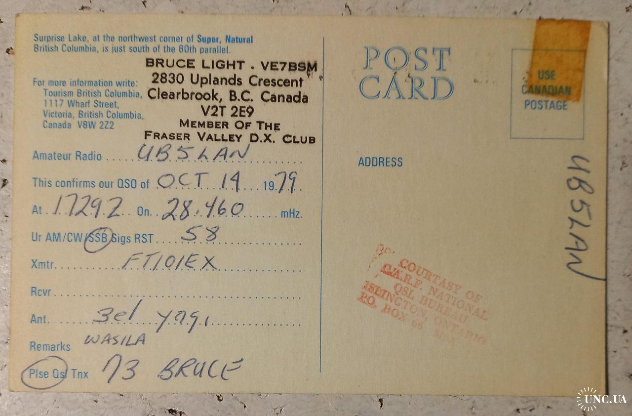 Использован бланк почтовой туристической открытки. На лицевой стороне супер вид на озеро и помещен позывной сигнал канадского радиолюбителя. На обратной стороне текст: «Озеро Сюрприз, расположенное на северо-западе супер природы Британской Колумбии, немного южнее 60-й параллели. Здесь же приведены данные радиообмена в эфире. В правом верхнем углу обратной стороны имеется небольшая скотчевая наклейка, не влияющая на общее состояние открытки. других дефектов нет. Состояние карточки хорошее.
