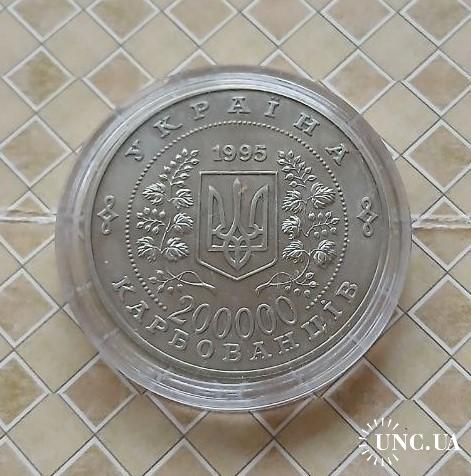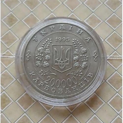 Аверс памятной монеты содержит изображение малого Государственного Герба Украины который обрамлен с двух сторон ветками калины. Над гербом размещена дата 1995 – год чеканки монеты, под гербом - в две строки по кругу надпись “200000 КАРБОВАНЦІВ”, который обозначает номинальную стоимость монеты, над гербом – надпись “УКРАЇНА”.