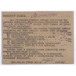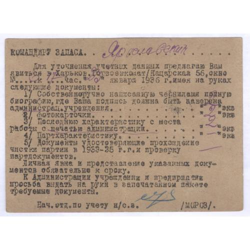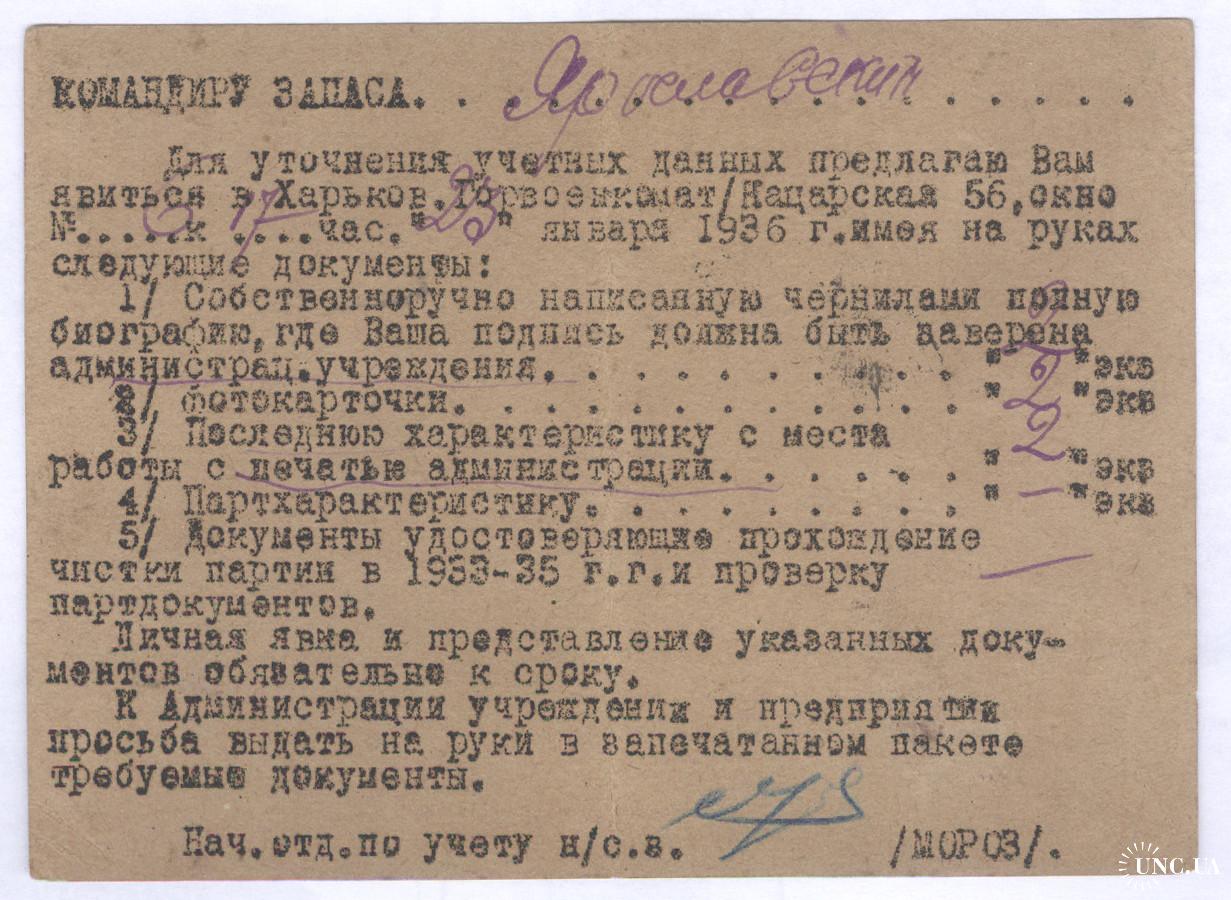 Текст: "Командиру запаса Ярославскому. Для уточнения учетных данных продлагаю Вам явиться в г. Харьков. Горвоенкомат / Кацарская 56, окно №617 час. 23 января 1936 г. имея на руках следующие документы: