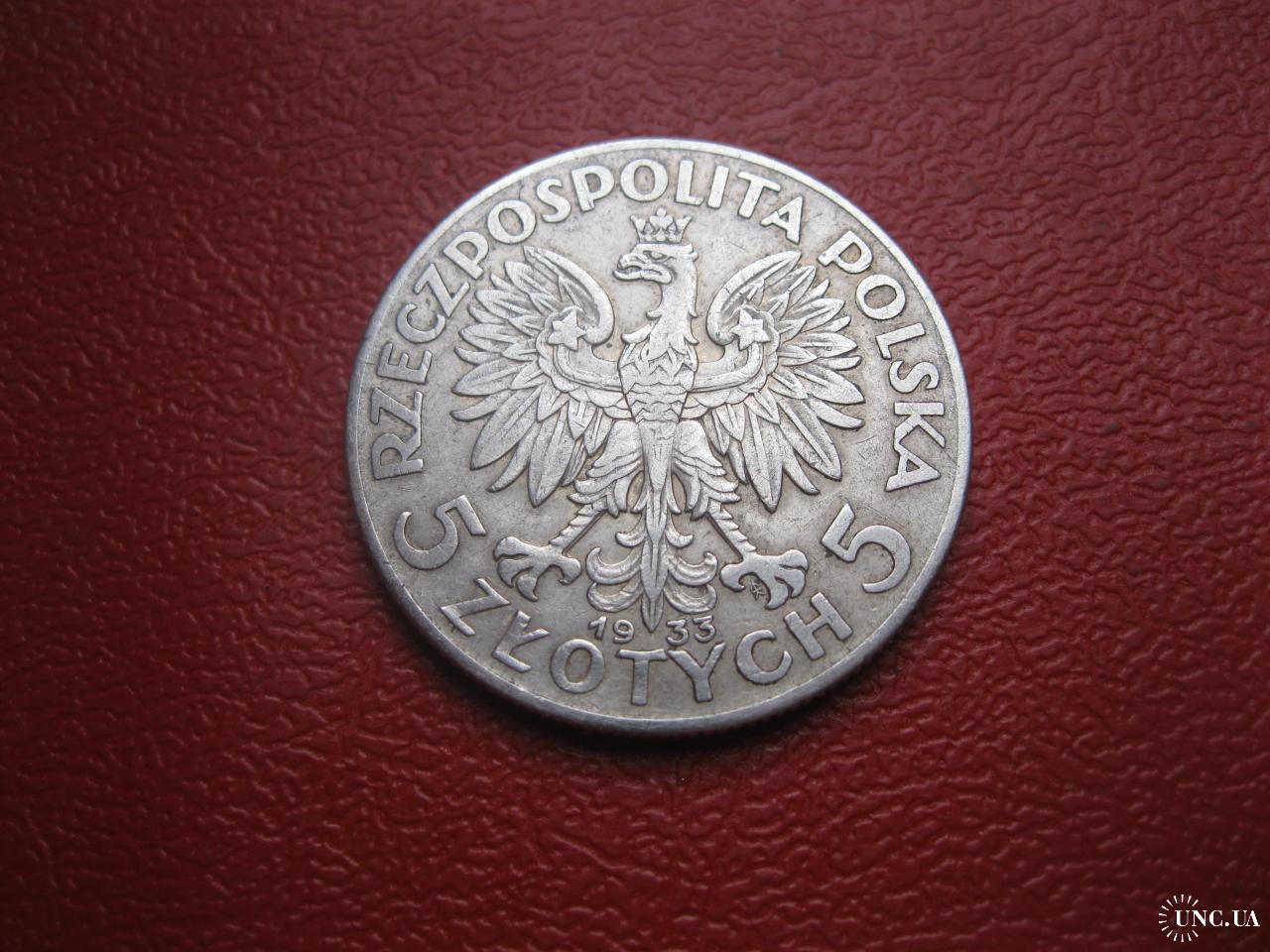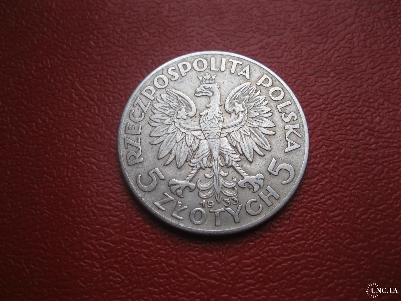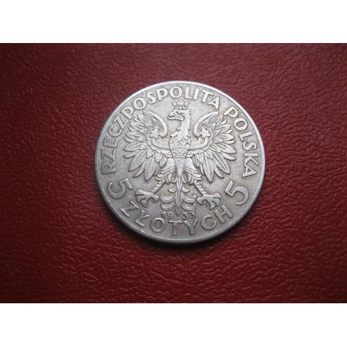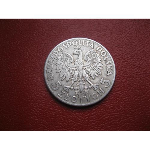 ОригіналПольша 5 злотых 1933 г. "Голова полонии" . Сохран .Серебро 750 проба. Оригинал. Состояние по фото