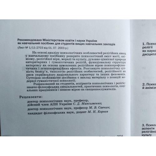 Фундаментальний підручник професора Віктора Павловича Москалеця — доктора психологічних наук, завідувача кафедри Прикарпатського національного університету, визнаного фахівця з психології релігії. Це перший в Україні систематичний підручник, що висвітлює психологічні аспекти релігійності з гуманістичних науково-методологічних позицій.