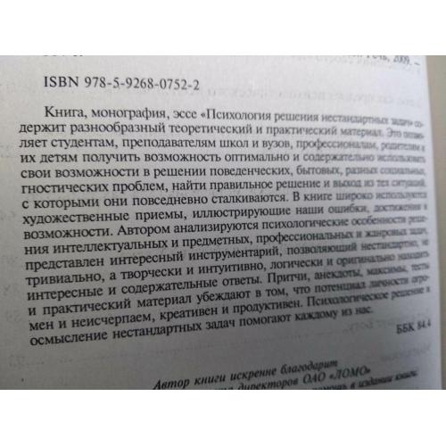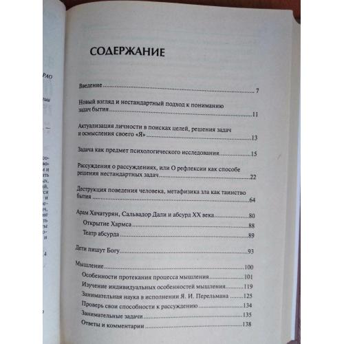 Автор предлагает набор психологических инструментов для преодоления стереотипов мышления, развития креативности и гибкости ума. В книге собраны нестандартные задачи разного уровня сложности: логические головоломки, задачи на латеральное мышление, психологические парадоксы, упражнения на преодоление психологической инерции. Каждая задача сопровождается не только ответом, но и психологическим анализом — почему большинство людей не могут найти решение и какие ментальные барьеры этому мешают. Сонин объясняет механизмы творческого мышления, учит видеть проблему под неожиданным углом и применять техники креативного решения в жизни и работе. Малый тираж делает издание библиографической редкостью.