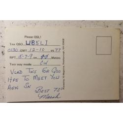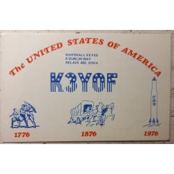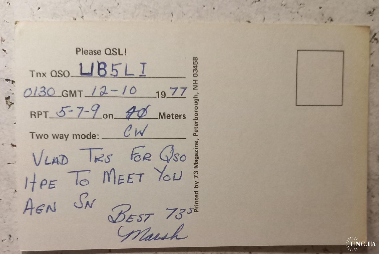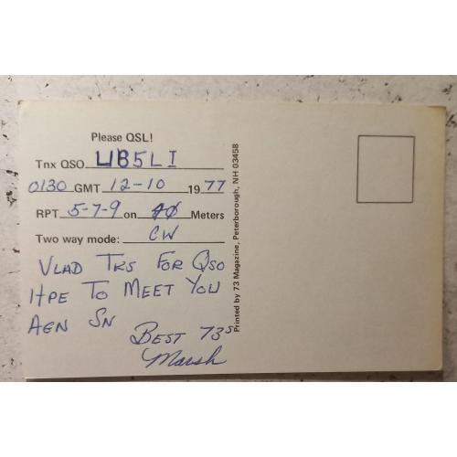 На лицевой стороне на фоне картинок исторических вех становления страны размещен позывной-сигнал американца и его локация. Бел-Эйр, не имеет широкой известности и является типичным американским пригородом, известным своим спокойным образом жизни, В локации применено почтовое сокращение наименования штата (MD), обычное сокращение – Md. Для любознательных: наименование штата произошло от первого поселения в этом месте Сент-Мэри, названное в честь небесной покровительницы королевы Генриетты Марии (Мери ленд – Земля Мери). На обратной стороне карточки – обычные данные радиообмена в эфире между американцем (Маршем) и моей персоной в Харькове. Карточка бездефектов. Состояние идеальное..