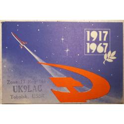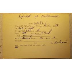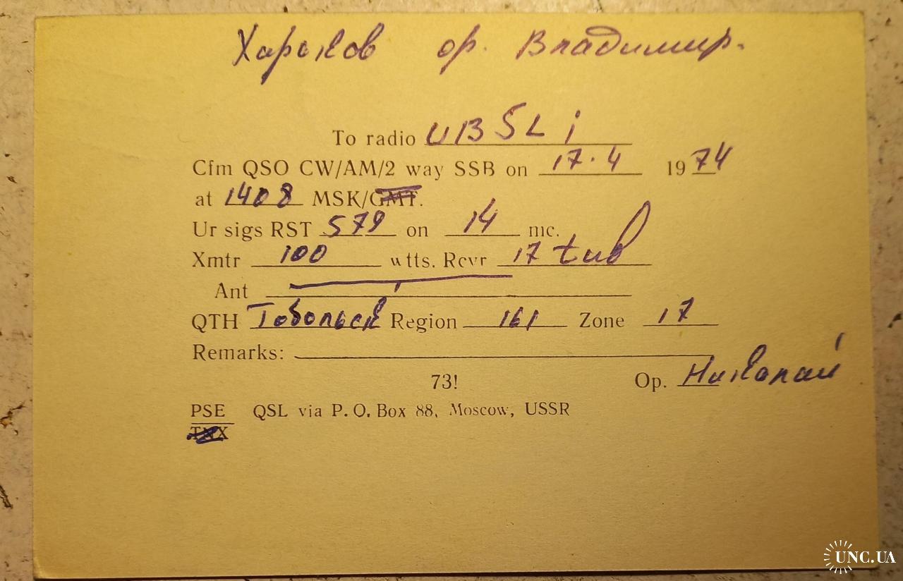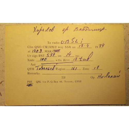 1961-1980Типовой бланк Центрального Радиоклуба СССР. Использовался всеми радиолюбителями СССР для обмена данными радиообмена в эфире по всему миру. Стоил 1 коп. и продавался в каждом радиоклубе ДОСААФ. В данном случае его использовали на коллективной радиостанции из Тобольска. Эти карточки закупали впрок сотнями штук. Поэтому она заполнена в 74-м году. из имеющихся запасов. Карточка без дефектов. Состояние отличное.