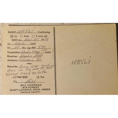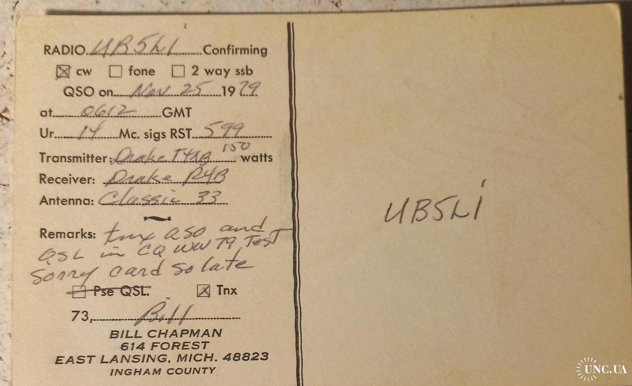 На лицевой стороне красным выделен позывной-сигнал американца Билла. Из пункиа локации Билла символически возвышается его антенна типа вращающийся «волновой канал» и надпись «Большая группа любителей дальних и редких связей ( на радиожаргоне это пишется, как’”DX”). Лансинг». В правой части имеется надпись: «Большая всемирная дружба через DX» и ниже эмблема Центрального любительского радиоклуба Мичигана, совмещенная с Радиолюбительской лигой США (ARRL). На обратной стороне карточки – данные радиообмена в эфире и локация (адрес) Билла Чапмана – это город Ист- Лансинг. Он находится в округах Ингем и КлинтонштатаМичиган. Большая часть города находится в округе Ингем, хотя небольшая часть простирается на север, в округ Клинтон. Население города около48 тыс. человек[4]. Город расположен к востоку от Лансинга, столицы Мичигана и шестого по численности населения города. Оба города входят в агломерацию Лансинг — Ист-Лансинг..Ист-Лансинг — университетский город, в котором находится университетштат Мичиган (MSU), один из крупнейших общественных университетов США. MSU играет в городе доминирующую роль в экономике и демографической ситуации.Данная карточка длялюбознательных коллекционеров представляет виртуальную возможность ощутить аутентичность этих мест. Карточка без дефектов. Состояние отличное.