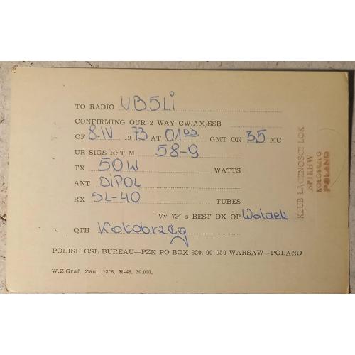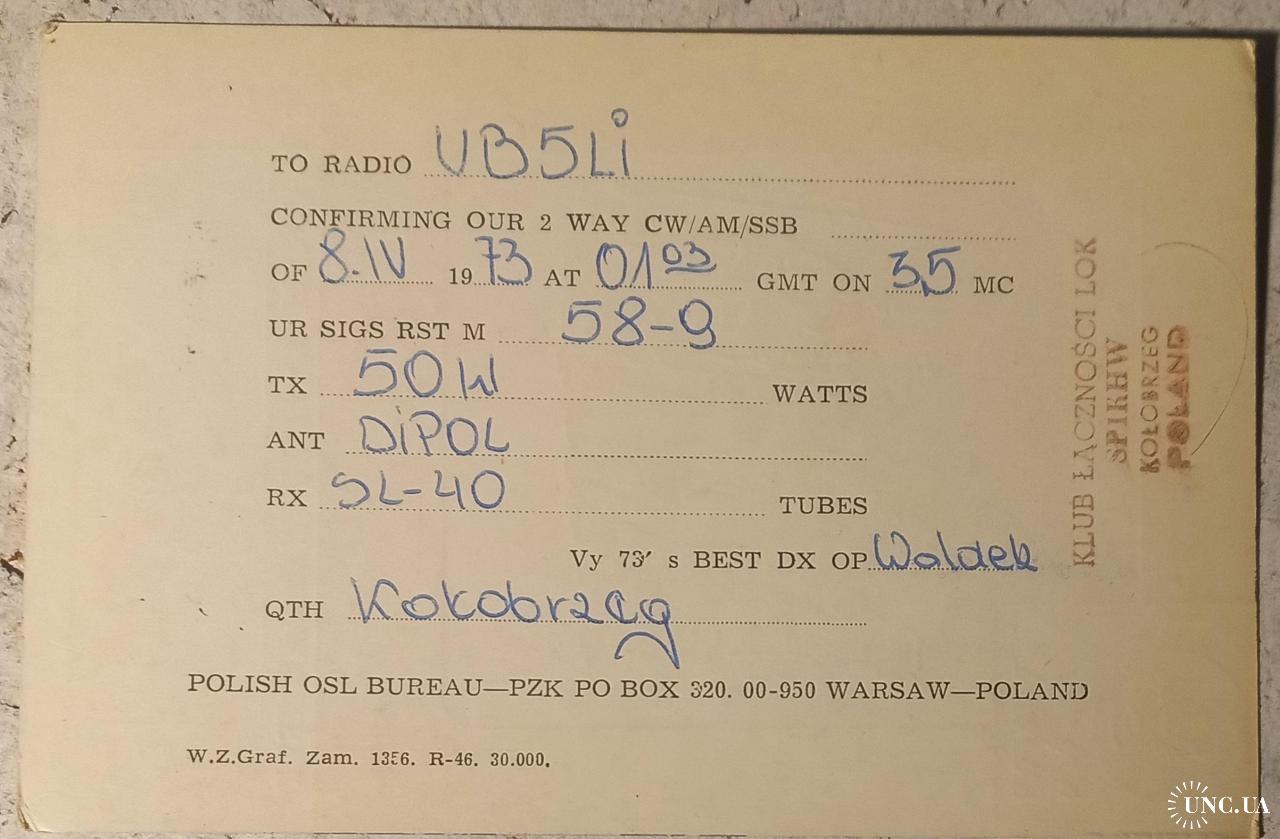 Польша надолго утрачивала доступ к Балтийскому морю после раздела Речи Посполитой в 1793 году. В феврале 1920 г. после поражения Германии Польше вернули коридор к морю, а в 1939 г. Польшу вновь лишила выхода к морю нацистская Германия. И, наконец, по условиям международных Ялтинской и Потсдамской конференций в 1945 году, Польше перешёл ряд немецких земель, получивших общее название «Возвращённые территории Польши», и доступ к Балтийскому морю был восстановлен вплоть до Щецина. 17 марта1945 года польская армия провела обручение в посёлке Мжежино, а на следующий день — в городе Колобжег. Данный типовой бланк польской QSL-карточки анонсирует 30 летний юбилей этой знаменательной даты, что видно из лицевой стороны, слева вверху.Внизу стоит штамп позывного-сигнала связного клуба и слева от него размещена эмблема LOK в Польше -это Liga Obrony Kraju (Лига защиты родины), общественная организация, образованная в 1953 году (ранее — Лига друзей солдата). Она занимается вопросами национальной обороны, стрелковым спортом, обучением водителей и техническими видами спорта.Это аналог ДОСААФ в СССР. Любительская радиосвязь в СССР относилась к техническим видам спорта ДОСААФ. На обратной стороне карточки приведены данные радиообмена в эфире и локация польской станции – Колобжег, а если на немецкий манер, то Кольберг – это маленький курортный городок в Польше с населением порядка 50 тысяч жителей. Колобжег расположен на побережье Балтийского моря. Источники питьевой минеральной воды и залежи торфяных грязей превратили городок в достаточно популярный лечебный курорт. Карточка без дефектов. Состояние отличное.