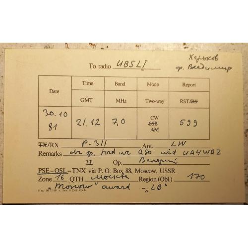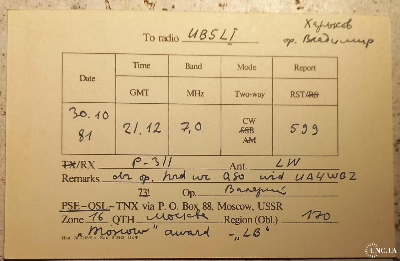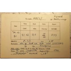 Это один из типовых бланков радиооткрыток распространяемых из Москвы по всем радиоклубам СССР. На лицевой стороне герб СССР обрамлен радиолюбительскими префиксами всех Советских республик. Диплом Р-10-Р выдавался за установление радиосвязей со всеми условными радиолюбительскими районами страны (от Северо-Западного, 1-й р-н. до Дальневосточного,0-й р-н.). Справа вверху размещены эмблемы всесоюзных обществ: Центрального Радиоклуба им. Кренкеля и Федерации радиоспорта СССР. Также на чистом поле карточки стоит штамп позывного сигнала радионаблюдателя. В данном случае москвича. На обратной стороне – таблица для заполнения данных радиообмена в эфире. Карточка без дефектов. Состояние отличное.