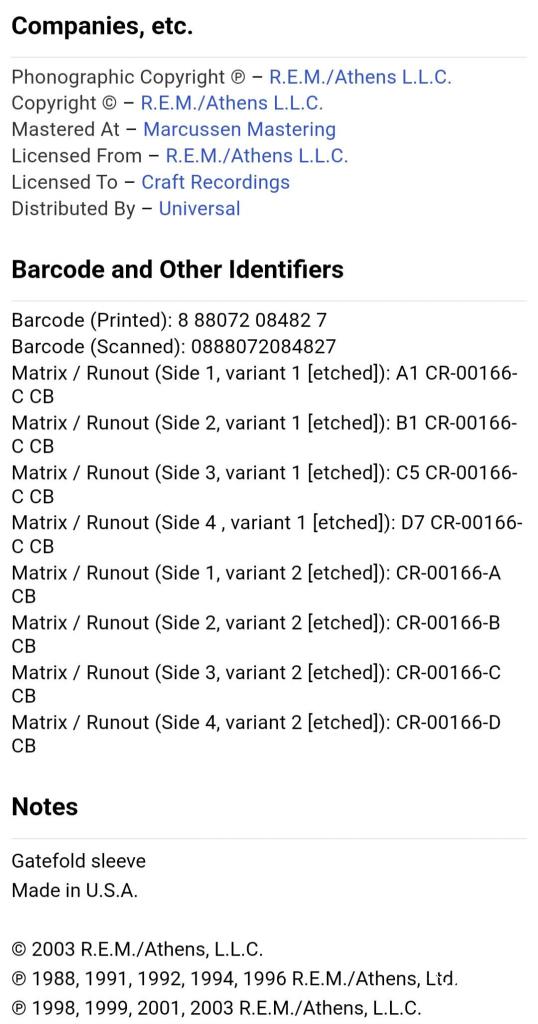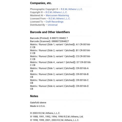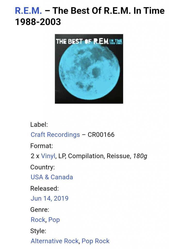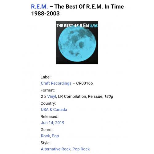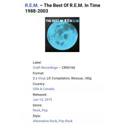 Вінілові платівки. Офіційна збірка найкращих хітів, рок-групи стилю альтернативний рок, колледж рок, дженгл поп R.E.M., учасниками якої за весь цей період були Майкл Стайп, Пітер Бак, Майк Міллз, Білл Беррі, Бертіс Давнс та Джефферсон Холт (The Best Of R.E.M. In Time) 1988-2003. Випуск фірми (Craft Recordings) USA & Canada, 2019-ий рік. Видання з двох платівок (2LP). Лімітований тираж (Limited Edition). Видання нове, запаковане. Категорія S/S. Відправка по Україні службами доставки: Нова Пошта, Укр Пошта, Делівері. Також відправляємо посилки за кордон по цілому світу.