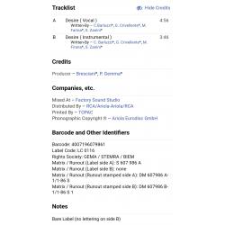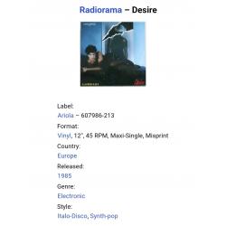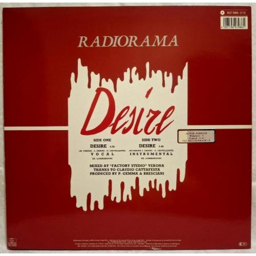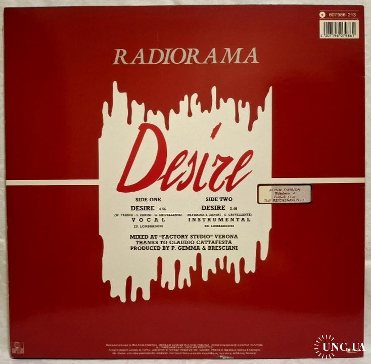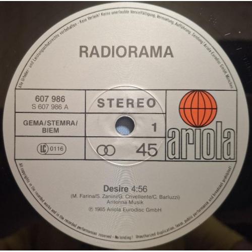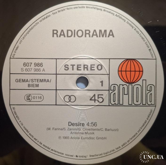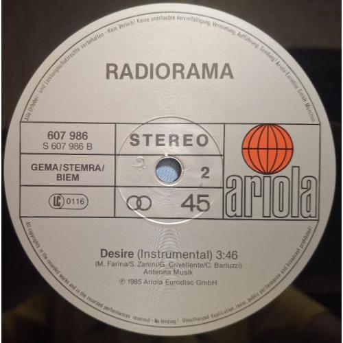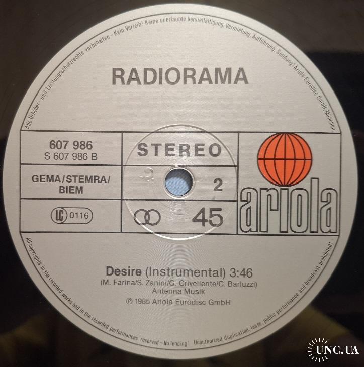 Вінілова платівка. Другий, в дискографії, студійний максі сингл (EP 12), Італійської євро диско, італо диско групи Radiorama, яка складалась на той час з учасників Мауро Фаріни та Сімони Дзаніні (Desire) 1985. Випуск фірми (Ariola) Germany, 1985-ий рік. Оригінальне, першопресове, Німецьке видання. Стан платівки EX+. Конверт глянцевий. Стан конверту ЕХ+. Відправка по Україні службами доставки: Нова Пошта, Укр Пошта, Делівері. Також відправляємо посилки за кордон по цілому світу.