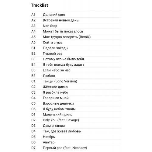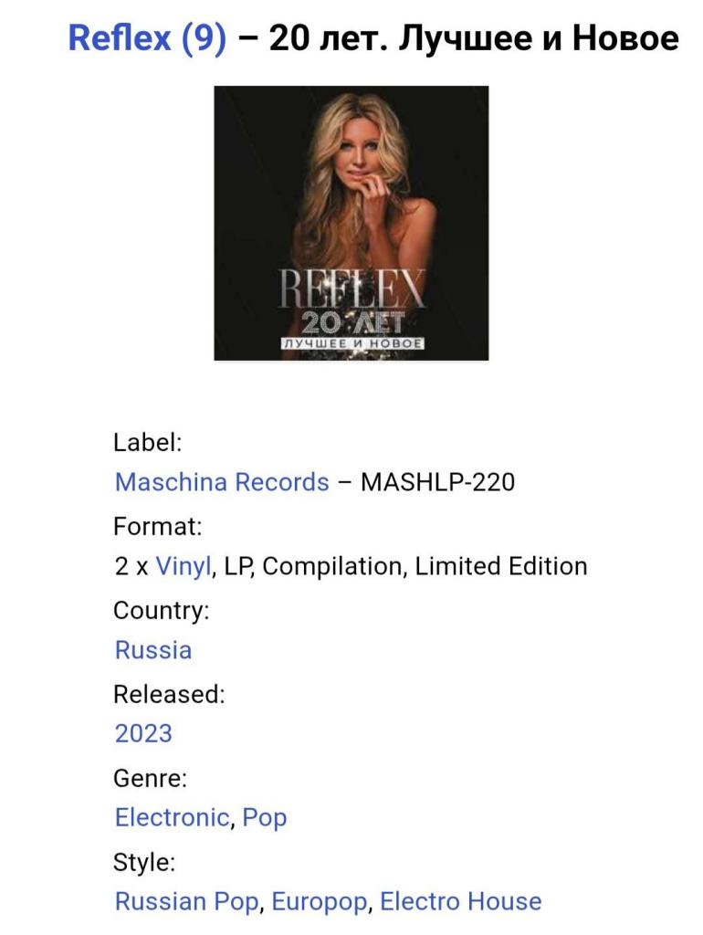Вінілові платівки. Збірка найкращих хітів, за всю дискографію, російської поп-групи Reflex, до складу якої за весь період часу входили учасники Ірина Нельсон, Ольга Кошелєва, Денис Давидовський, Григорій Розов, Олена Торганова, Женя Малахова, Анастасія Студенікіна, Олена Максимова та Анна Бастон (20 Лет. Новое и Лучшее) 2001-2022. Випуск фірми (Maschina Records) Estonia, 2023-ій рік. Видання з двох платівок (2LP). Лімітований тираж (Limited Edition) Нове, запаковане. Категорія S/S. Відправка по Україні службами доставки: Нова Пошта, Укр Пошта, Делівері. Також відправляємо посилки за кордон по цілому світу.
