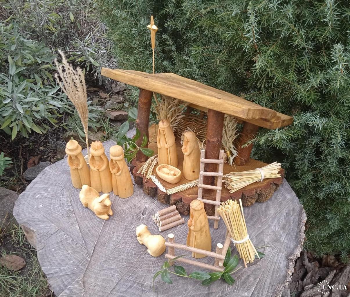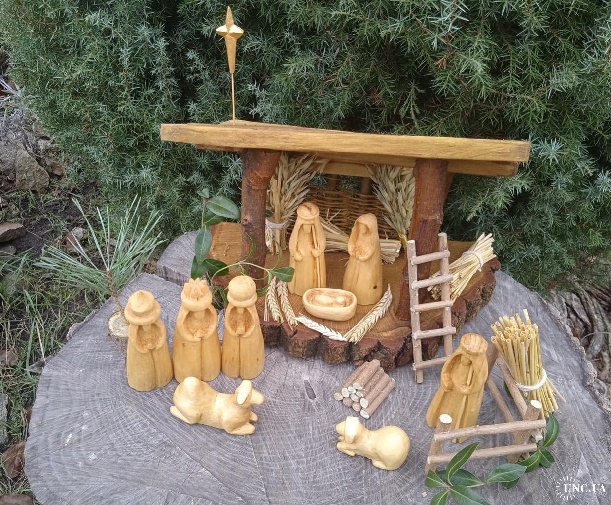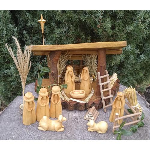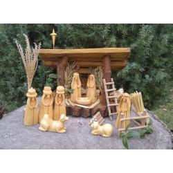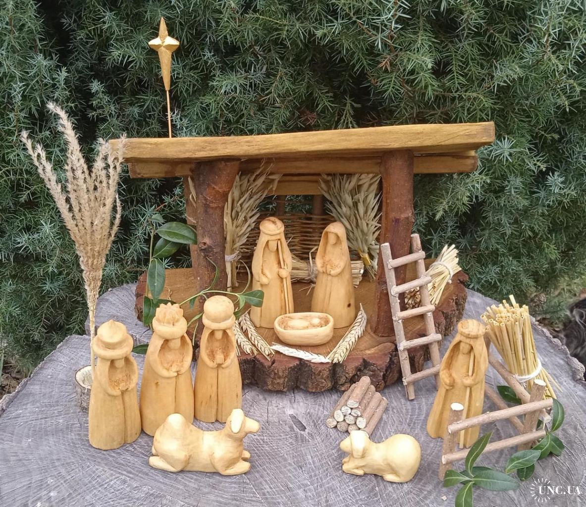 Різдвяна шопка з різьбленими вручну фігурками Божої Матері, Йосипа,