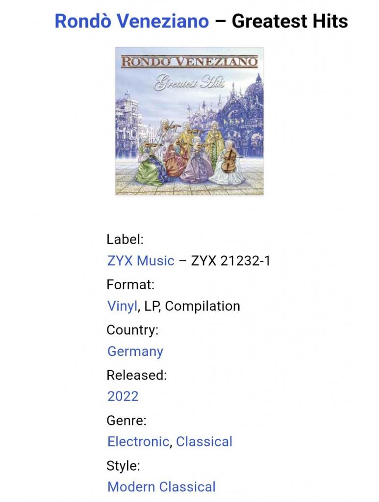 Вінілова платівка. Офіційна збірка найкращих хітів Італійського камерного оркестру з сучасною ритмікою стилю нео класика, Rondo Veneziano, керівником якого є Джан Пьеро Ревербери (Greatest Hits & Remixes) 1980-2009. Випуск фірми (Zyx Music) Germany, 2022-ий рік. Лімітований тираж (Limited Edition). Видання нове, запаковане. Категорія S/S. Відправка по Україні службами доставки: Нова Пошта, Укр Пошта, Делівері. Також відправляємо посилки за кордон по цілому світу.