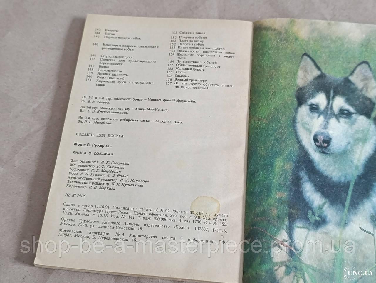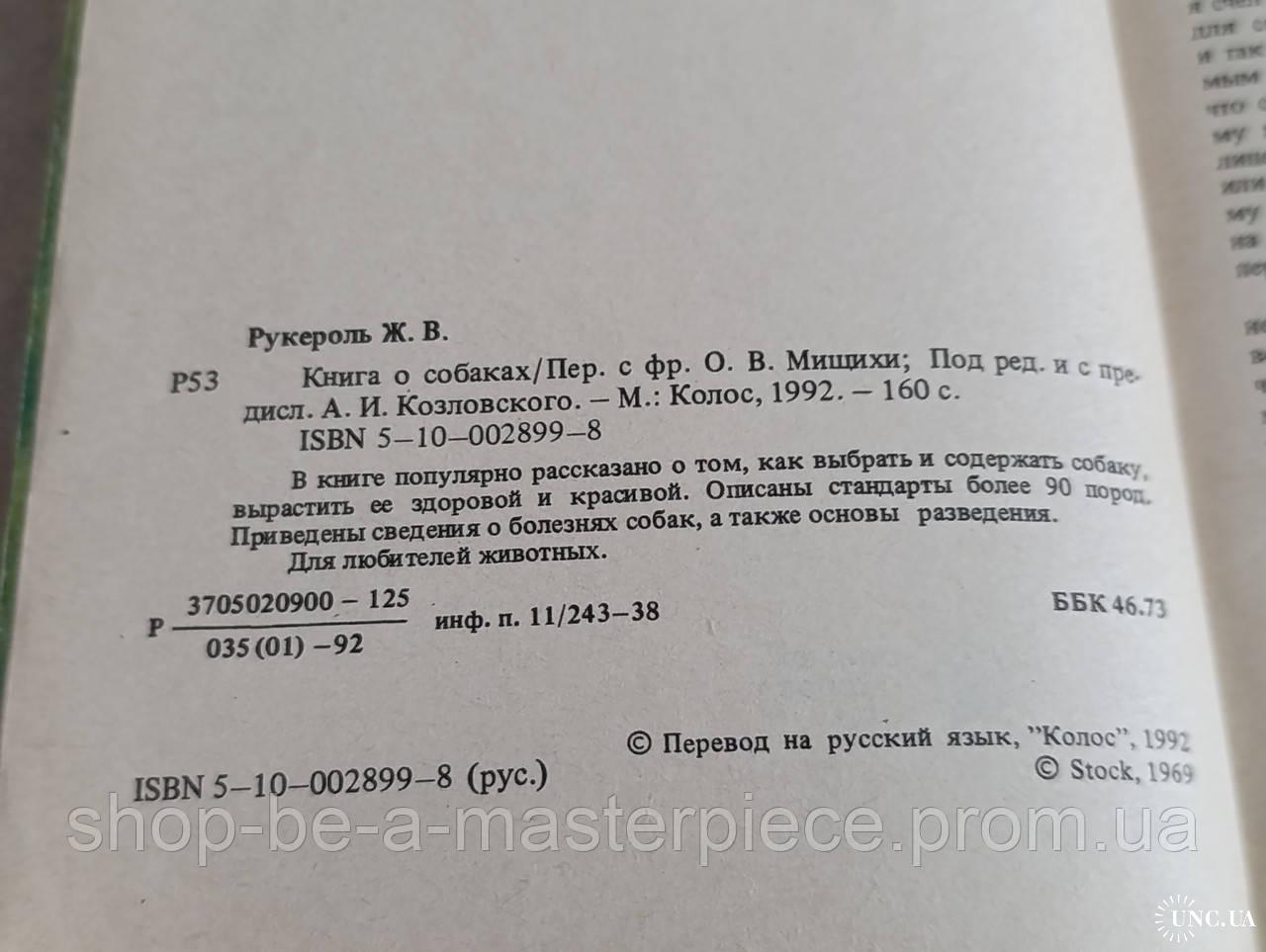 Рукероль Жорж В. Книга о собаках /Пер. с фр. О. В. Мищихи; Под ред. и с пре дисл. А. И. Козловского. 1992. - 160 с. Книга в мякій обкладинці Стан добрий, всі сторінки на місці В книге популярно рассказано о том, как выбрать и содержать собаку, вырастить ее здоровой и красивой. Описаны стандарты более 90 пород. Приведены сведения о болезнях собак, а также основы разведения. Для любителей животных.Відповіді продавця на ваші питання