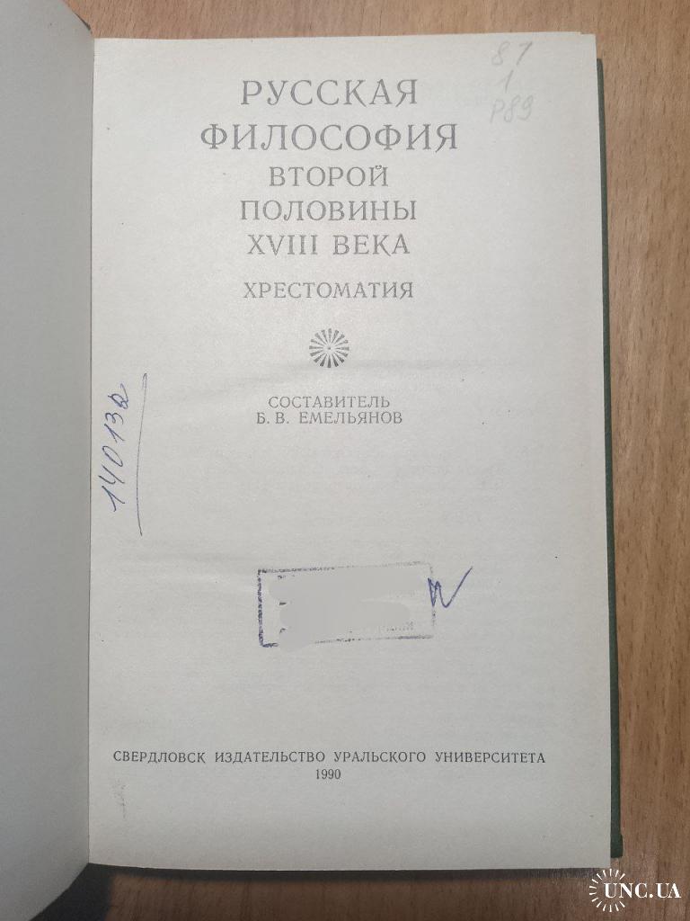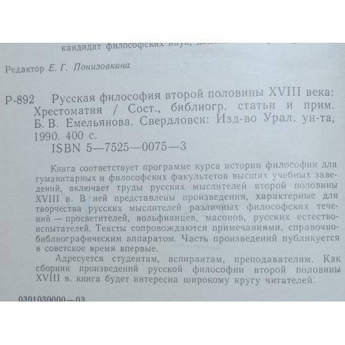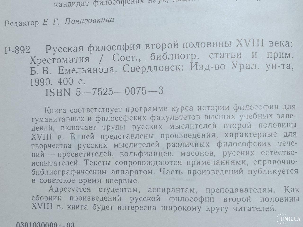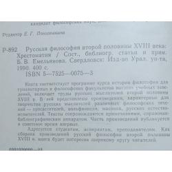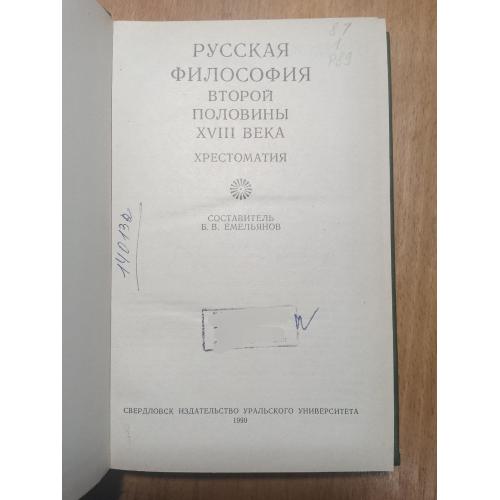 Русская философия второй половины XVIII века. Хрестоматия. Составитель Емельянов. Издательство Уральского университета. 1990 года. Библиотечная, но в очень хорошем состоянии.