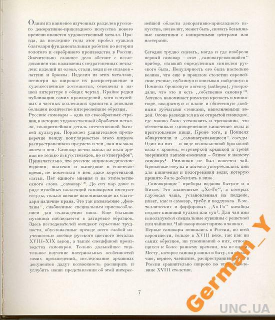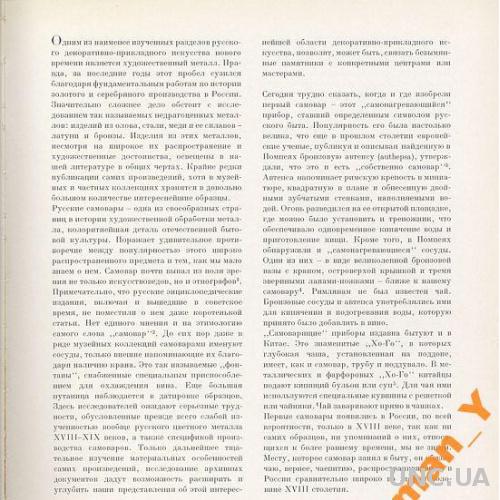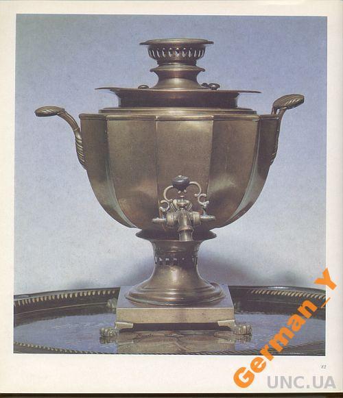 В альбом вошел и ряд образцов из Государственного музея этнографии народов СССР, Краеведческого музея города Великий Устюг и некоторых других музеев, а также из собрания ленинградца П. П. Кваскова. В издании, кроме того, представлена металлическая утварь и „окружение" самовара: чайная посуда, сервизы, подносы.