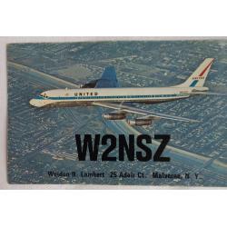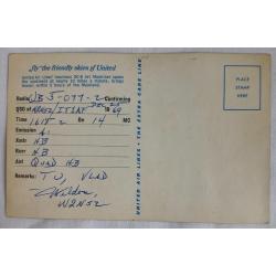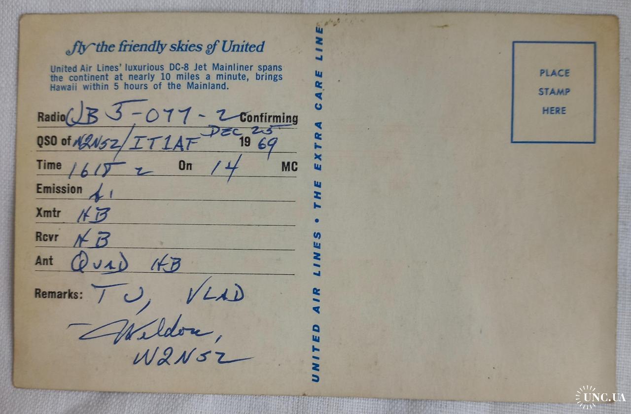 Использован бланк почтовой открытки с изображением пассажирского самолета. Также на лицевой стороне размещен позывной сигнал радиолюбителя из США и его локация. На обратной стороне имеется рекламная надпись: «Летайте в дружелюбном небе United. Роскошный реактивный самолёт DC-8 Mainliner авиакомпании United Air Lines пересекает континент со скоростью почти 16 километров в минуту, доставляя на Гавайи всего за 5 часов». Здесь также приведены данные радиообмена в эфире. Карточка без дефектов. Состояние отличное.
