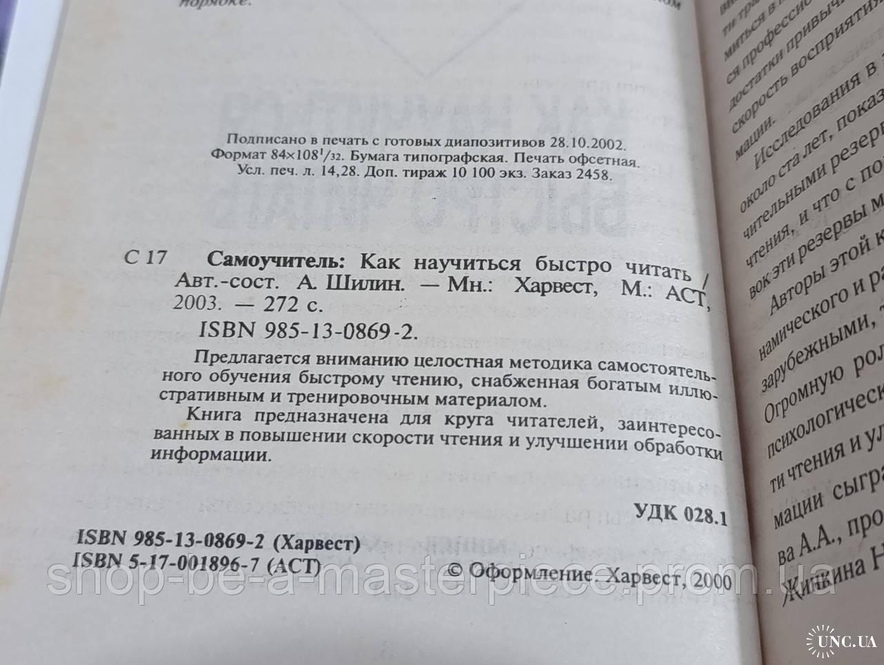 Самоучитель: Как научиться быстро читать А. Шилин 2003 272 с. твердая обложка состояние идеальное Предлагается вниманию целостная методика самостоятель ного обучения быстрому чтению, снабженная богатым иллюстративным и тренировочным материалом. Книга предназначена для круга читателей, заинтересо-ванных в повышении скорости чтения и улучшении обработки информации.Відповіді продавця на ваші питання