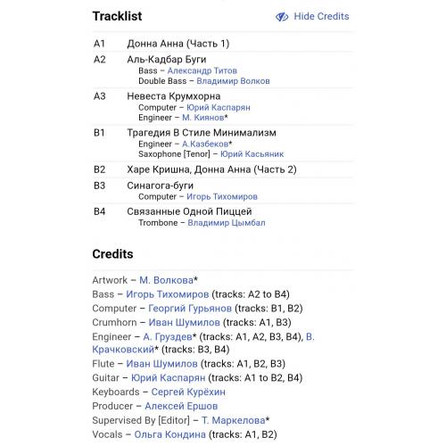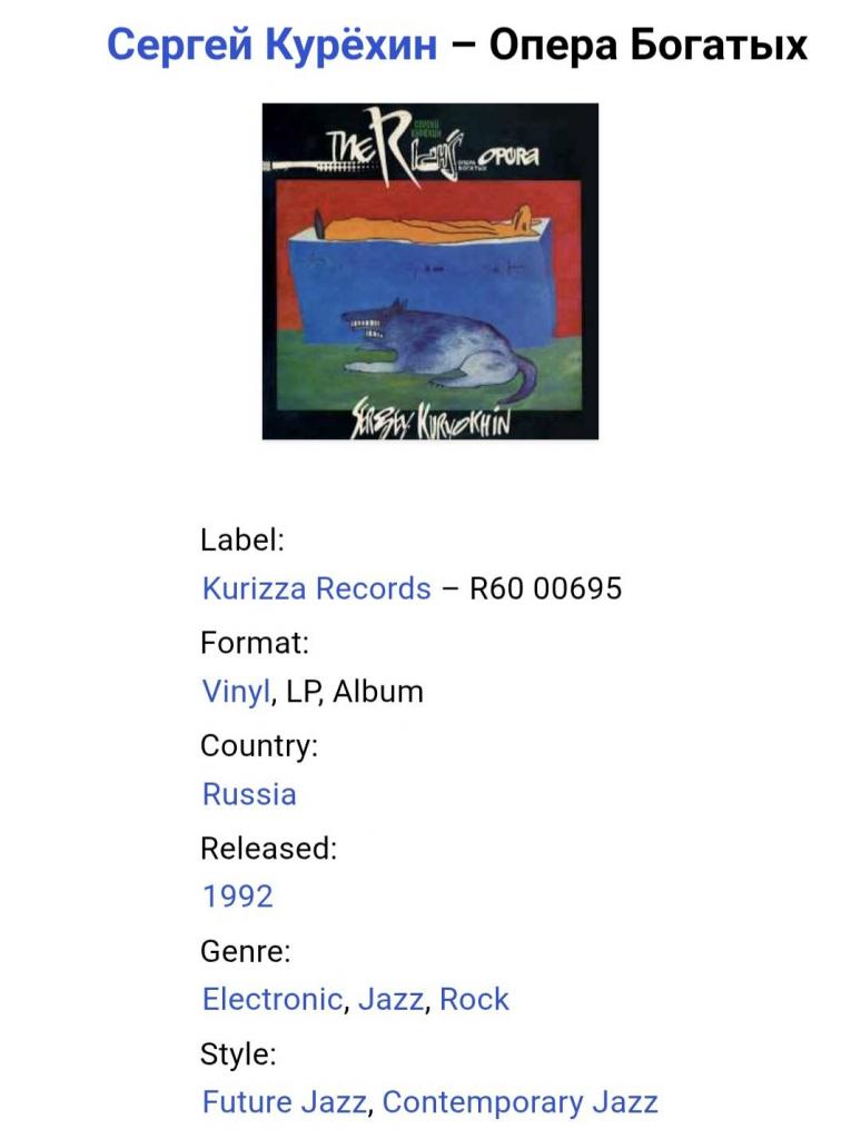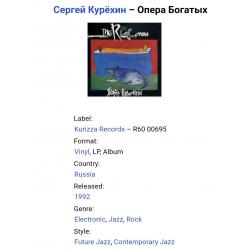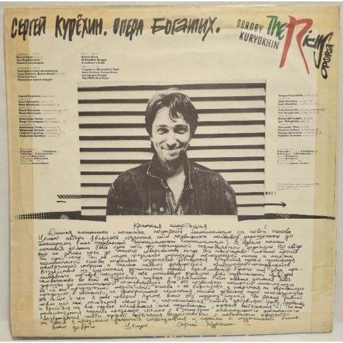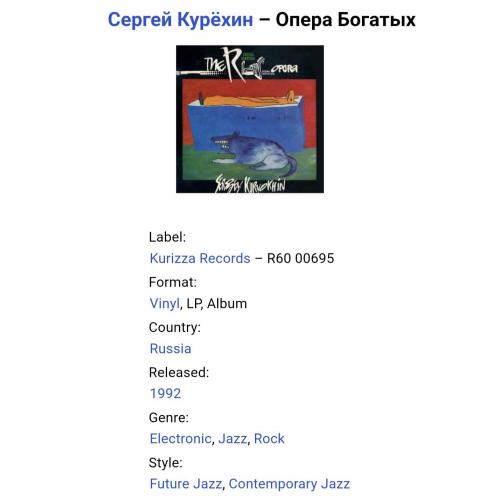 Вінілова платівка. Двадцять третій, в дискографії, студійний альбом російського (радянського) композитора, актора та рок музиканта-авангардиста, засновника та керівника музичного проекту Поп Механіка, покійного вже, Сергія Курьохіна та музикантів групи Кіно (Опера Богатых) 1992. Випуск фірми (Kurizza Records) Russia 1992-ий рік. Оригінальне, першопресове видання. Лімітований тираж (Limited Edition). Рідкісне (Rare). Стан платівки EX+. Стан конверту EX- (присутній скотч по торцам конверту). Відправка по Україні службами доставки: Нова Пошта, Укр Пошта, Делівері. Також відправляємо посилки за кордон по цілому світу.