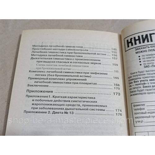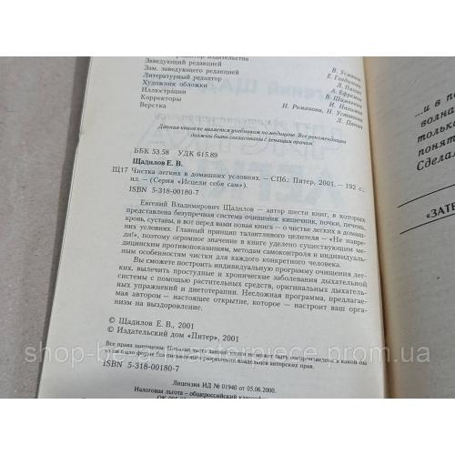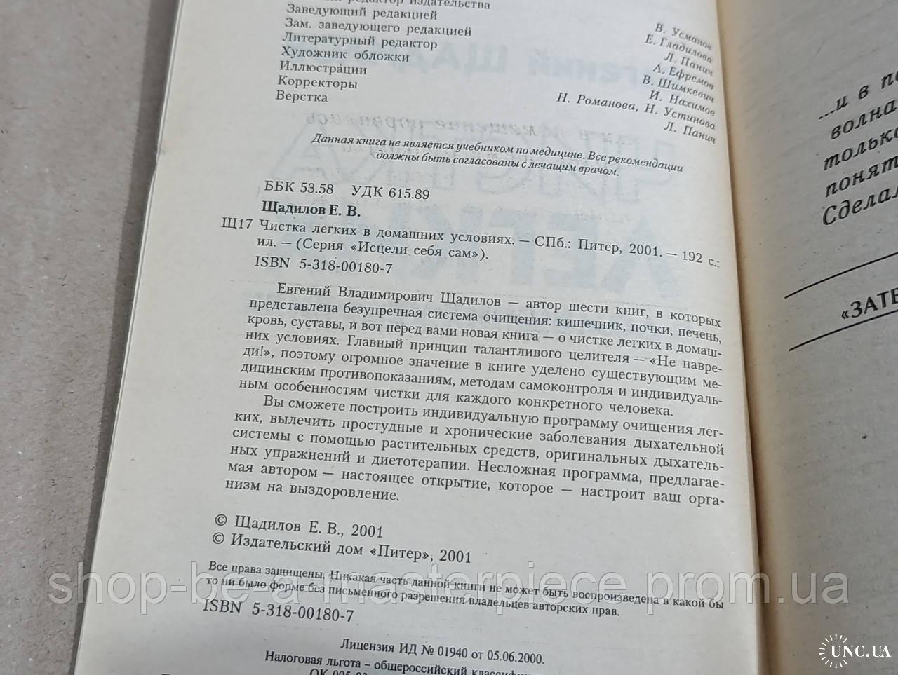 Щадилов Евгений Чистка легких в домашних условиях 2001 мягкая обложка. состояние отличное СПб.: Питер, 2001. – 192 с.: ил. (Серия «Исцели себя сам»). Евгений Владимирович Щадилов автор шести книг, в которых представлена безупречная система очищения: кишечник, почки, печень, кровь, суставы, и вот перед вами новая книга о чистке легких в домашних условиях. Главный принцип талантливого целителя «Не навреди!», поэтому огромное значение в книге уделено существующим медицинским противопоказаниям, методам самоконтроля и индивидуальным особенностям чистки для каждого конкретного человека. Вы сможете построить индивидуальную программу очищения лег-ких, вылечить простудные и хронические заболевания дыхательной системы с помощью растительных средств, оригинальных дыхательных упражнений и диетотерапии. Несложная программа, предлагаемая автором настоящее открытие, которое настроит ваш организм на выздоровление © Издательский дом «Питер», 2001Відповіді продавця на ваші питання