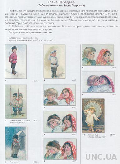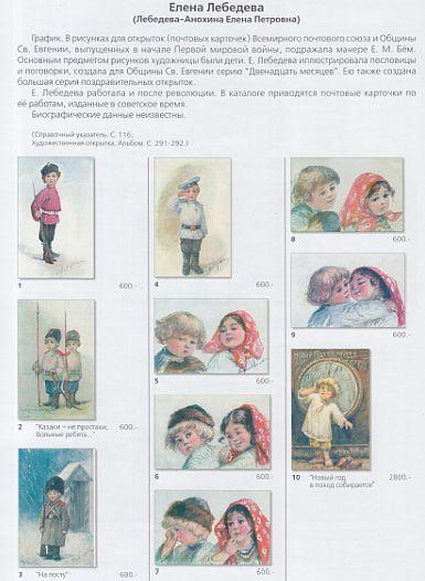 В каталог включены иллюстрированные почтовые карточки, выполненные по рисункам художников Елены Лебедевой, Любови Эндауровой и Бориса Зворыкина.