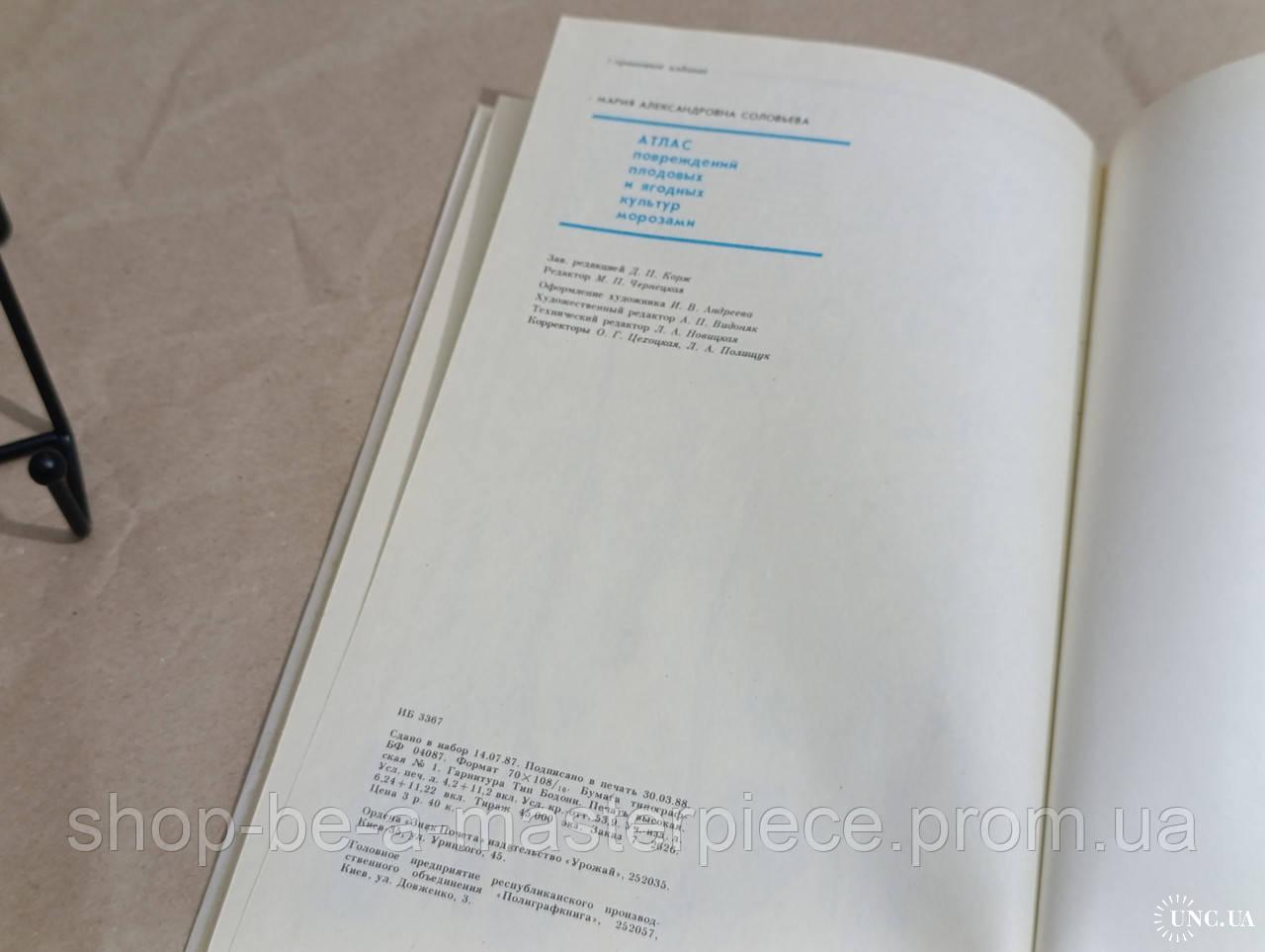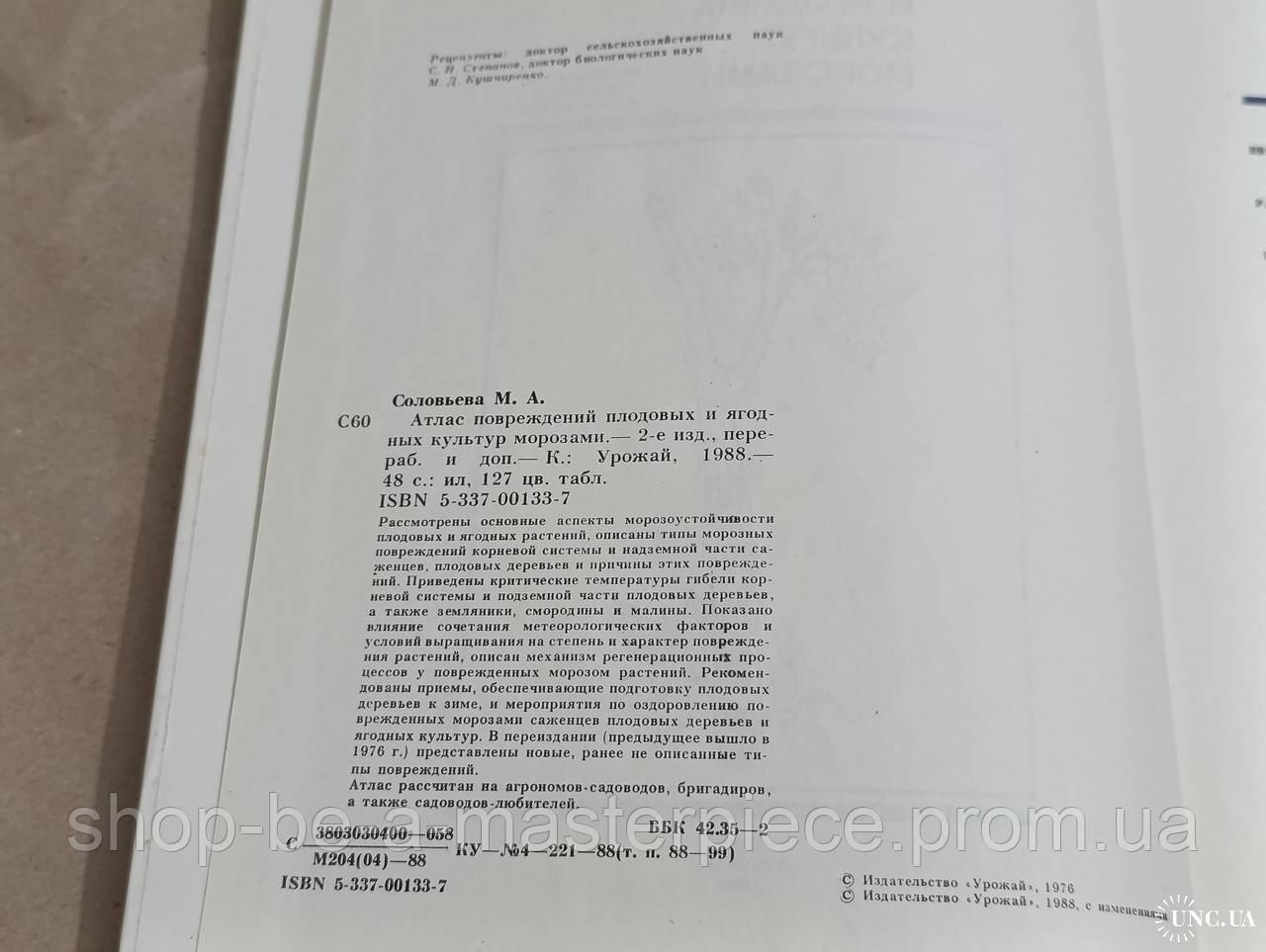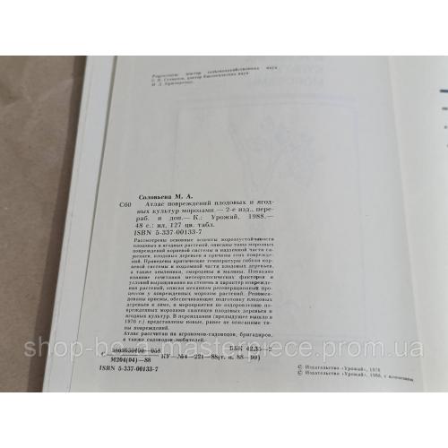 Соловьева М. А. Атлас повреждений плодовых и ягодных культур морозами 1988 Твёрдый глянцевый переплет. Состояние отличное 2-е изд., пере-раб. и доп.- К.: Урожай, 1988.-48 с.: ил. 127 цв. табл. Рассмотрены основные аспекты морозоустойчивости плодовых и ягодных растений, описаны типы морозных повреждений корневой системы и надземной части саженцев, плодовых деревьев и причины этих повреждений. Приведены критические температуры гибели кор невой системы и подземной части плодовых деревьев, а также земляники, смородины и малины. Показано влияние сочетания метеорологических факторов и условий выращивания на степень и характер повреждения растений, описан механизм регенерационных процессов у поврежденных морозом растений. Рекомендованы приемы, обеспечивающие подготовку плодовых деревьев к зиме, и мероприятия по оздоровлению поврежденных морозами саженцев плодовых деревьев и ягодных культур. В переиздании (предыдущее вышло в 1976 г.) представлены новые, ранее не описанные типы повреждений. Атлас рассчитан на агрономов-садоводов, бригадиров, а также садоводов-любителей.Відповіді продавця на ваші питання