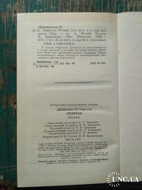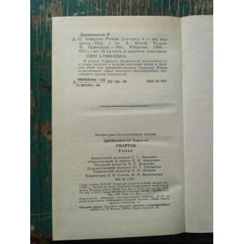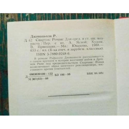 Спартак. Рафаэлло Джованьоли. "Юнацтва", Минск, 1988 г., новая книга |
