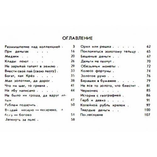 В своей книге писатель Геннадий Семар рассказывает об основах нумизматики, ее загадках и тайнах. По мнению автора, нумизматика является одним из источников, питающих историю, политэкономию, географию и другие науки. Увлечение нумизматикой расширит кругозор молодого человека в самых различных областях культуры.