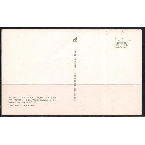 Фаунапочтовая карточка без марки, 1968 г., почтовая карточка, фауна, рыбки, Барбус Суматранус, икромечущая. Родина - Индонезия, стоимостью 15 грн.