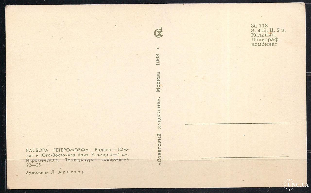 Фаунапочтовая карточка без марки, 1968 г., почтовая карточка, фауна, рыбки, икромечущая. Расбора Гетероморфа. Родина - Южная и Юго-Восточная Азия, стоимостью 15 грн.