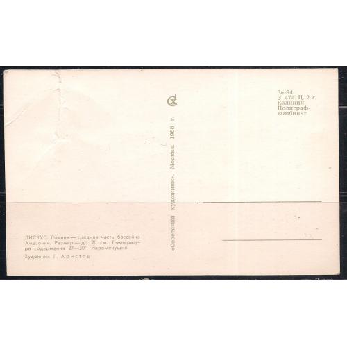 Фаунапочтовая карточка без марки, 1968 г., почтовая карточка, фауна, рыбки, карточка надорвана, Дискус, икромечущая. Родина - Амазония, стоимостью 10 грн.