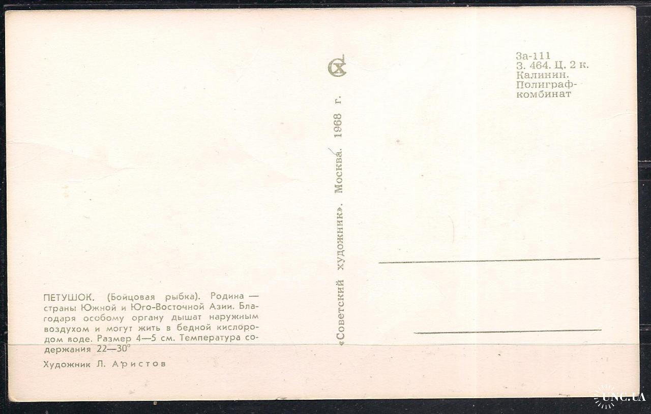 Фаунапочтовая карточка без марки, 1968 г., почтовая карточка, фауна, рыбки, Петушок, икромечущая. Родина - Южной и Юго-Восточной Азии, стоимостью 15 грн.