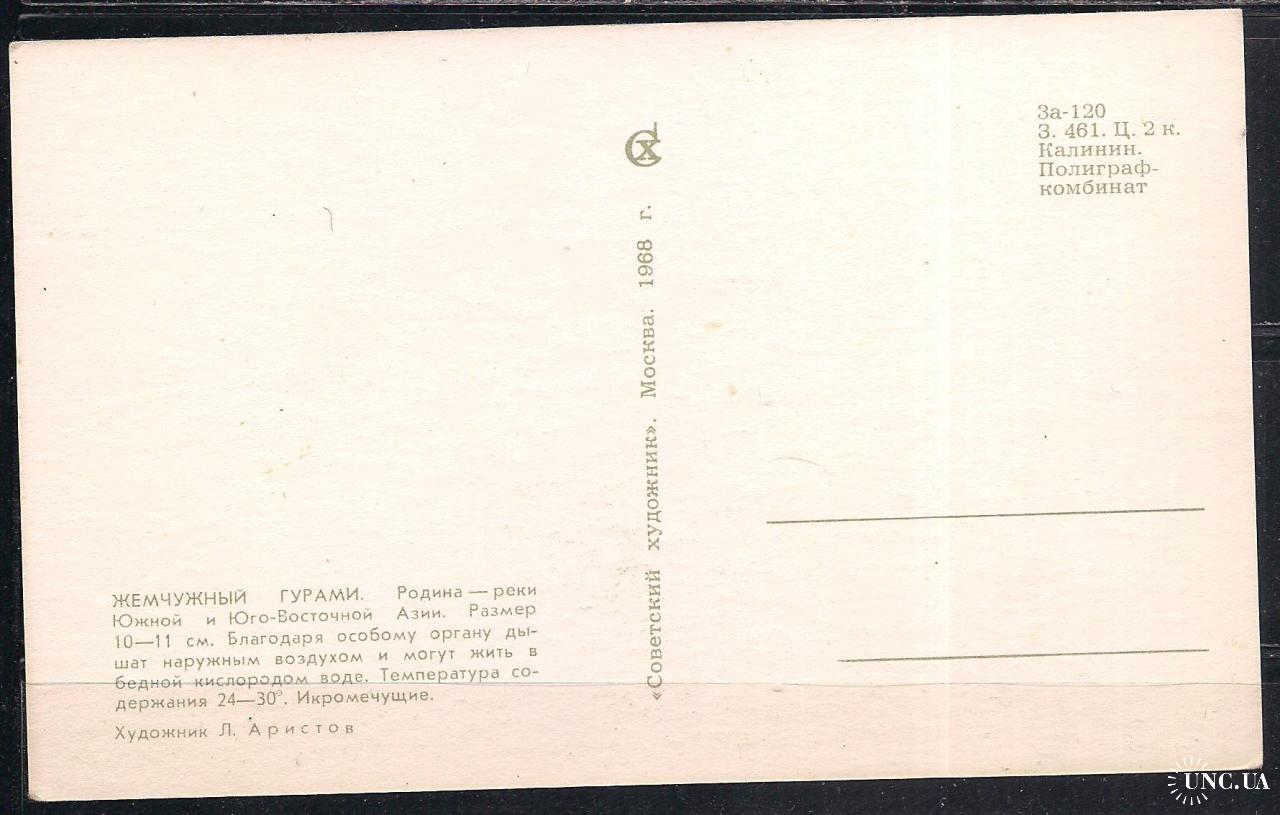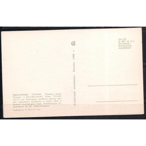 Фаунапочтовая карточка без марки, 1968 г., почтовая карточка, фауна, рыбки, Жемчужный Гурами, икромечущая. Родина - Южная и Юго-Восточная Азия, стоимостью 15 грн.