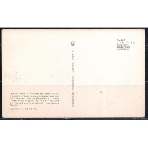 Фаунапочтовая карточка без марки, 1968 г., почтовая карточка, фауна, рыбки, живородящая. Гуппи Хейнеля. Выведена искусственным путем, стоимостью 15 грн.