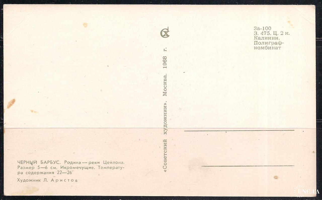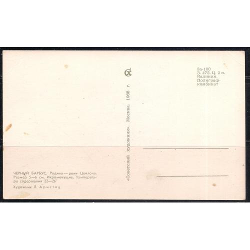 Фаунапочтовая открытка без марки, 1968 г., почтовая открытка, фауна, рыбки, Черный Барбус, икромечущие. Родина - Цейлон, стоимостью 15 грн.