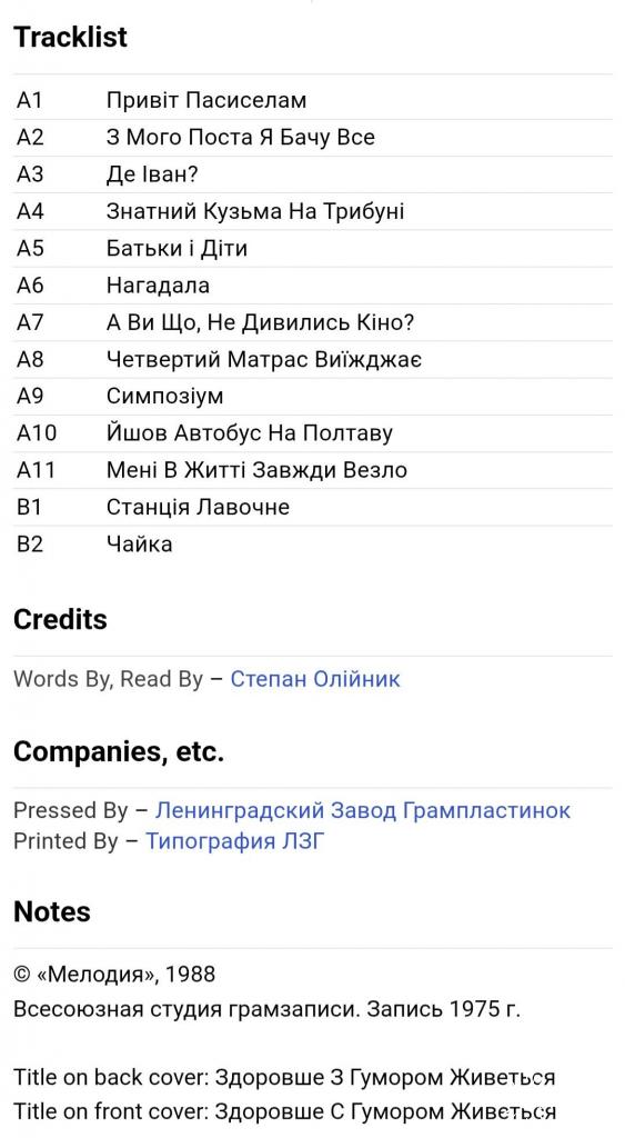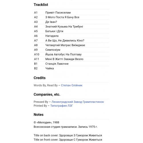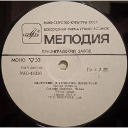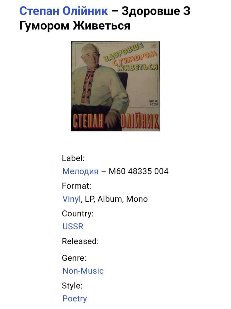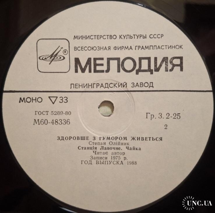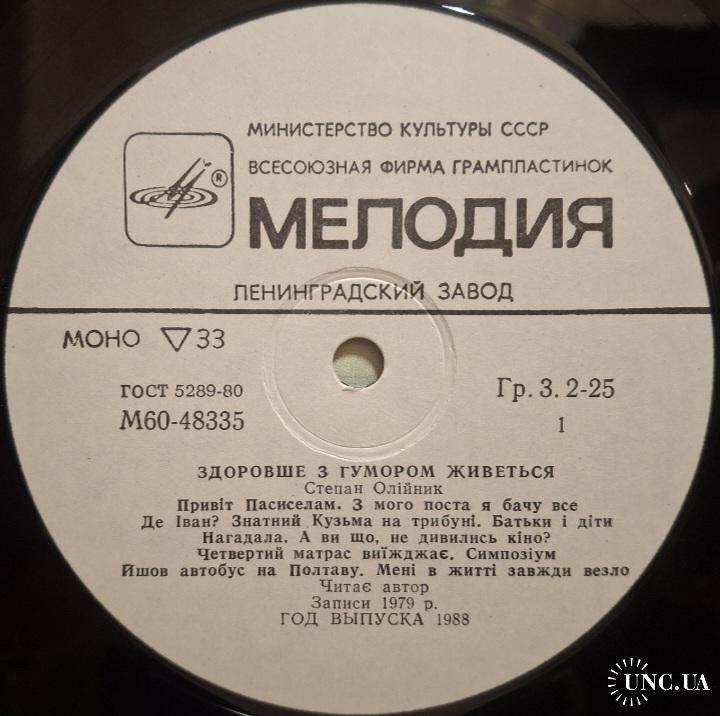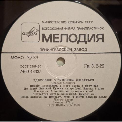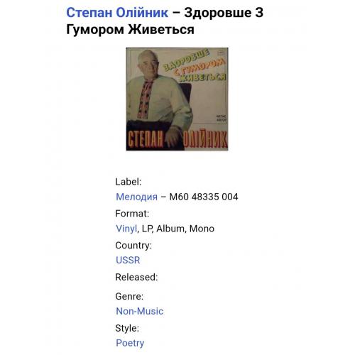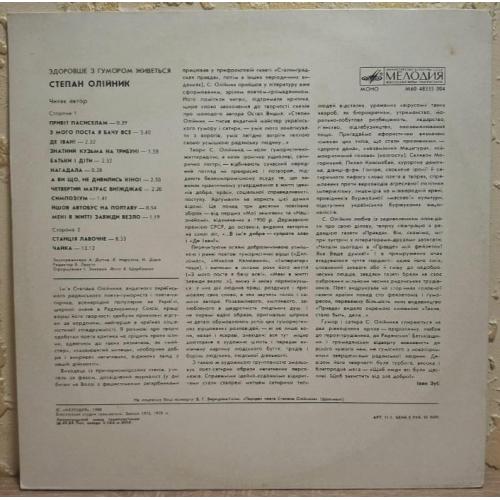 Вінілова платівка. Збірка гумористичних поезій від Українського (радянського) поета-гумориста, сатирика, Степана Олійника (Здоровше з Гумором Живеться) 1975,79. Випуск фірми (Мелодія) СРСР, Ленінградський завод грамплатівок, 1988-ий рік. Рідкісне видання (Rare). Лімітований тираж (Limited Edition). Стан платівки NM-. Стан конверту NM-. Відправка по Україні службами доставки: Нова Пошта, Укр Пошта, Делівері. Також відправляємо посилки за кордон по цілому світу.