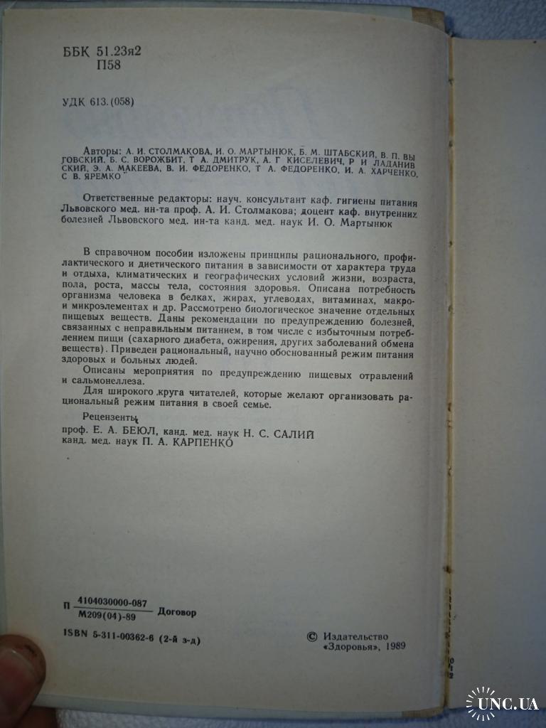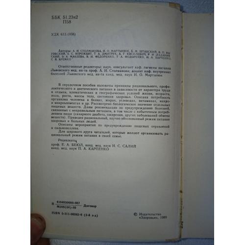 Изложены принципы рационального, профилактического питания в зависимости от характера труда и отдыха, климатических и географических условий жизни, возраста, пола, роста, массы тела, состояния здоровья. Описана потребность организма человека в белках и жирах, углеводах, витаминов, макро- и микроэлементов и др. Рассмотрено биологическое значение некоторых веществ. Даны рекомендации по предупреждению болезней, связанных с неправильным питанием, в том числе с избыточным потреблением пищи (сахарного диабета, ожирения, др.заболеваний обмена веществ). Приведен рациональный, научно обоснованный режим питания здоровых и больных людей. Описаны мероприятия по предупреждению пищевых отравлений и сальмонеллеза.