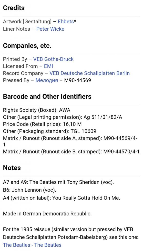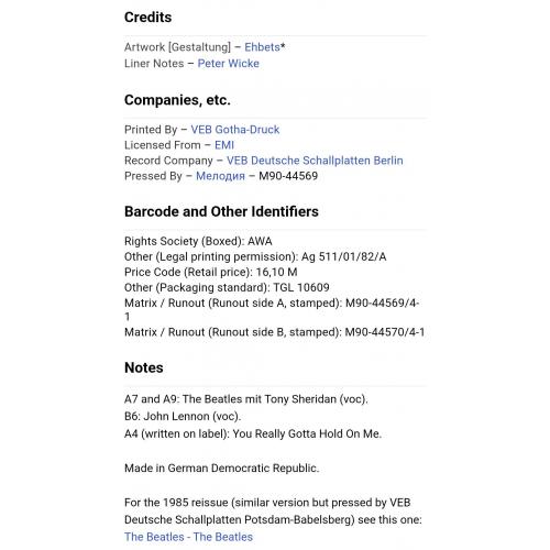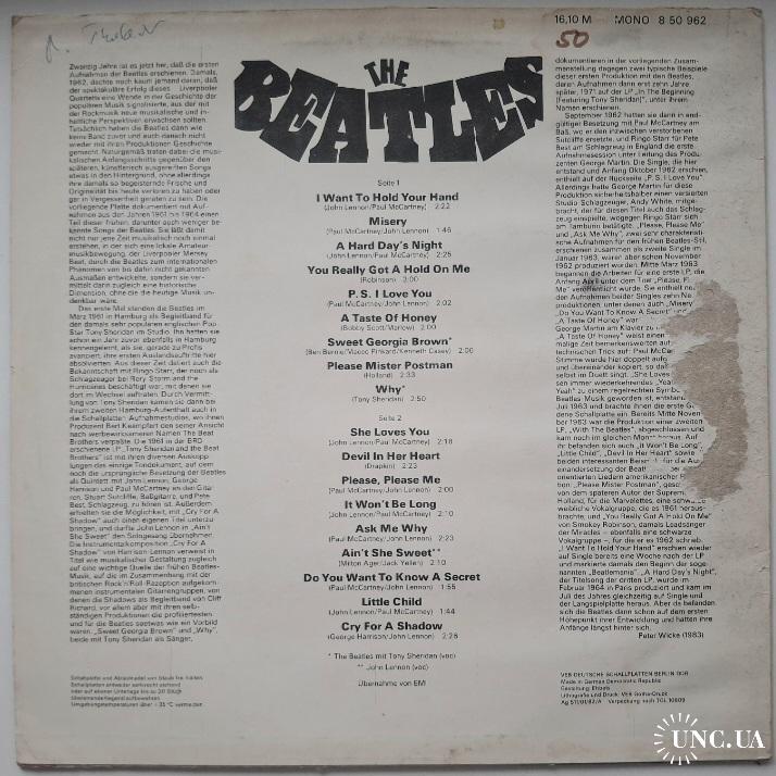 1961-1980Вінілова платівка. Збірка ранніх хітів, легендарної Британської біг-біт, рок-групи із Ліверпуля, The Beatles, яка складалась з учасників Джона Леннона, Пола Маккартні, Джорджа Харрісона та Рінго Старра (Compilation) 1962-64. Випуск фірми (Amiga) DDR, 1983-ій рік. Стан платівки EX-. Стан конверту VG+. Відправка по Україні службами доставки: Нова Пошта, Укр Пошта, Делівері. Також відправляємо посилки за кордон по цілому світу.