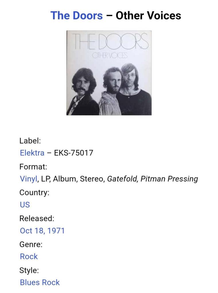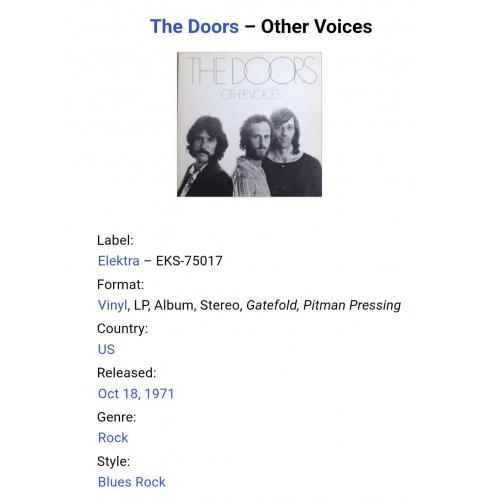 Вінілова платівка. Сьомий, в дискографії, студійний альбом, і перший, без свого лідера Джима Моррісона, який передчасно помер, Американської прог-рок, психоделік-рок групи з Лос Анджелеса, The Doors, учасниками якої, най той час, були Рей Манзарек, Роббі Крігер та Джон Денсмор (Other Vouces) 1971. Випуск фірми (Elektra) USA, 1971-ий рік. Оригінальне, рідне, першопресове, Штатовське видання. Стан платівки ЕХ. Конверт розворотний (Gatefold). Стан конверту ЕХ- (таможній надріз кута). В комплекті внутрішня вставка. Відправка по Україні службами доставки: Нова Пошта, Укр Пошта, Делівері. Також відправляємо посилки за кордон по цілому світу.