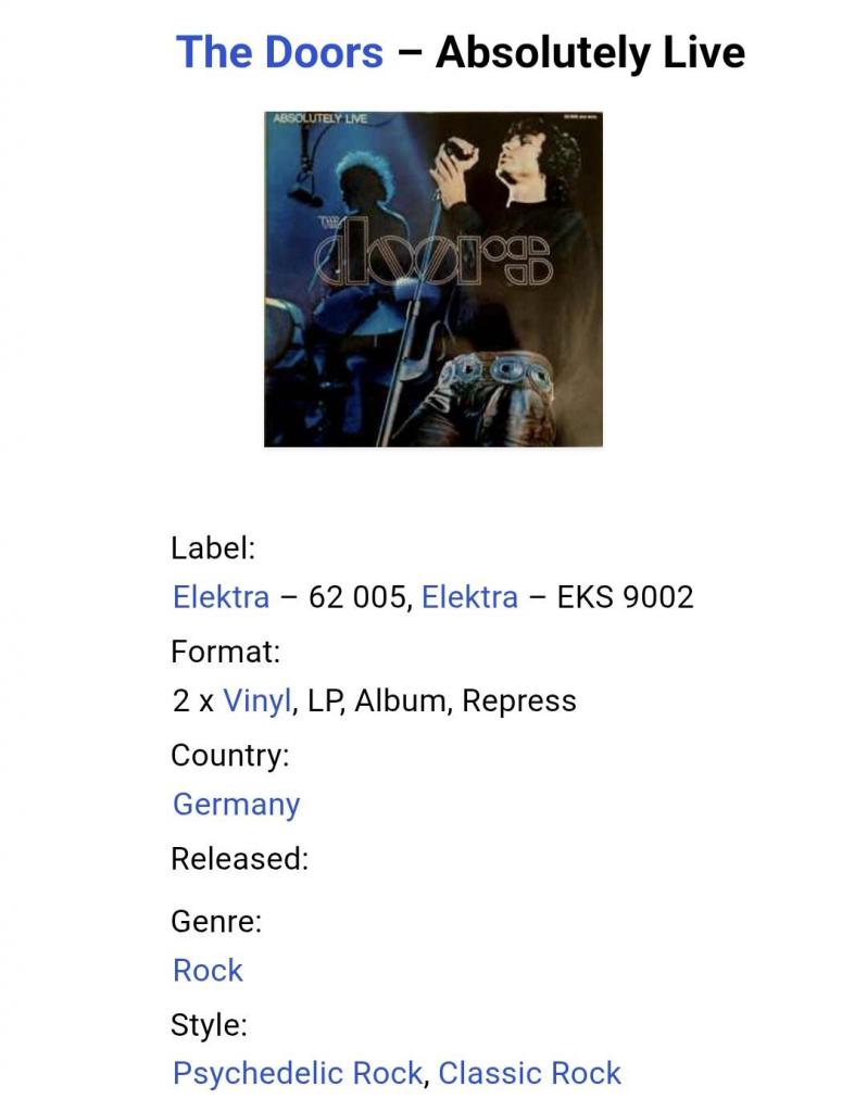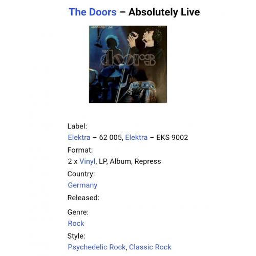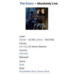 Вінілові платівки. Живий виступ. Перший, в дискографії, концертний альбом, Американської прог-рок, психоделік-рок групи з Лос Анджелеса, The Doors, учасниками якої, най той час, були, Джим Моррісон, Рей Манзарек, Роббі Крігер та Джон Денсмор (Absolutely Live) 1970. Випуск фірми (Elektra) Germany. Рік випуску невідомий. Видання з двох платівок (2LP). Стан платівок NM-. Конверт глянцевий, розворотний (Gatefold). Стан конверту ЕХ+. Відправка по Україні службами доставки: Нова Пошта, Укр Пошта, Делівері. Також відправляємо посилки за кордон по цілому світу.