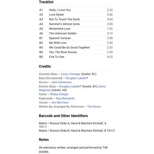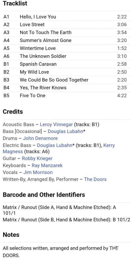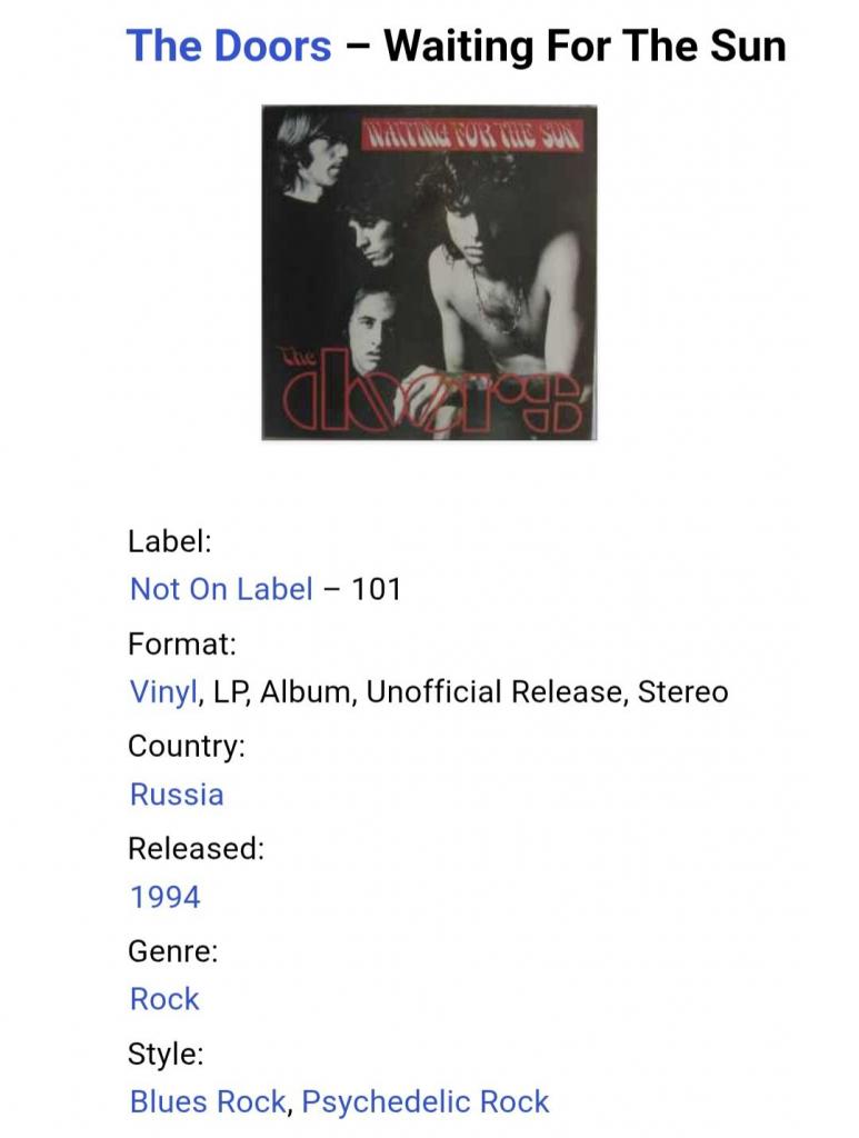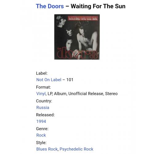 Вінілова платівка. Третій, в дискографії, студійний альбом, Американської прог-рок, психоделік-рок групи з Лос Анджелеса, The Doors, учасниками якої, най той час, були, Джим Моррісон, Рей Манзарек, Роббі Крігер та Джон Денсмор (Waiting For The Sun) 1968. Неофіційне видання (Unofficial Release). Рідкісне (Rare). Випущено невідомою фірмою в 1994-му році. Стан платівки ЕХ+. Конверт ламінований. Стан конверту ЕХ+. Відправка по Україні службами доставки: Нова Пошта, Укр Пошта, Делівері. Також відправляємо посилки за кордон по цілому світу.