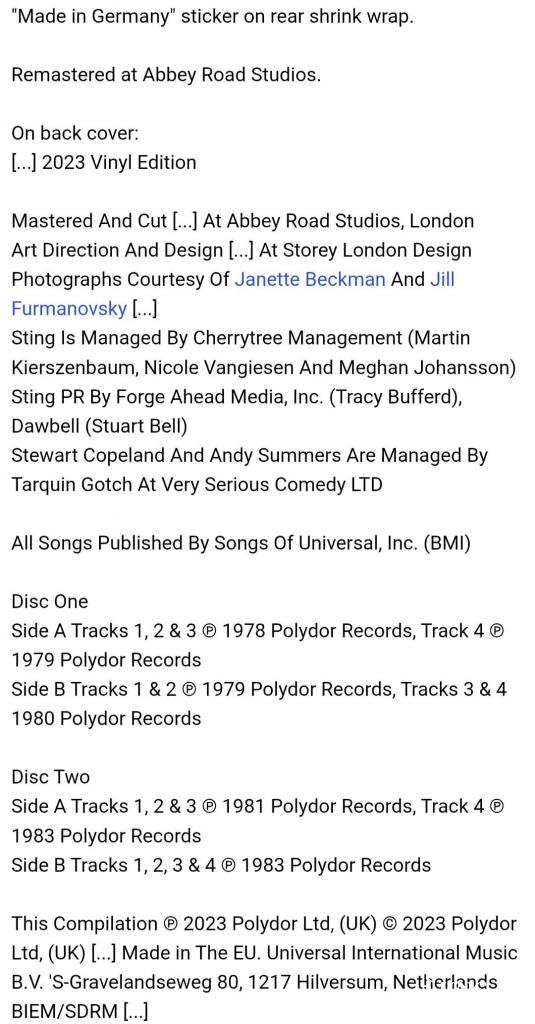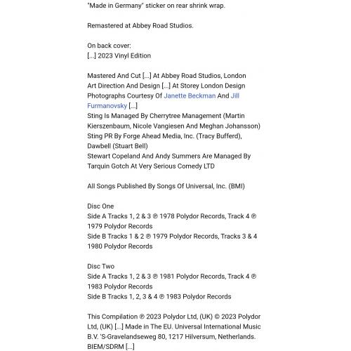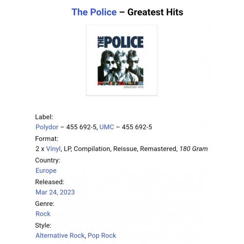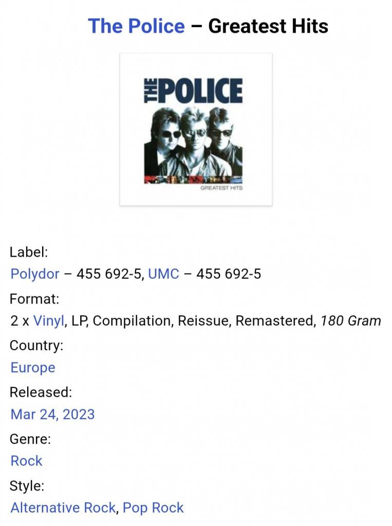 Вінілові платівки. Офіційна збірка найкращих хітів за всю дискографію, яка вийшла в 1992-му році, Британської пост панк групи нової хвилі The Police, до складу якої входили учасники Стінг, Енді Саммерс, Стюардт Коупленд та Генрі Падовані (Greatest Hits) 1978-83. Випуск фірми (Polydor / UMC) Europe, 2023-ій рік. Видання з двох платівок (2LP). Нове, запаковане. Категорія S/S. Відправка по Україні службами доставки: Нова Пошта, Укр Пошта, Делівері. Також відправляємо посилки за кордон по цілому світу.