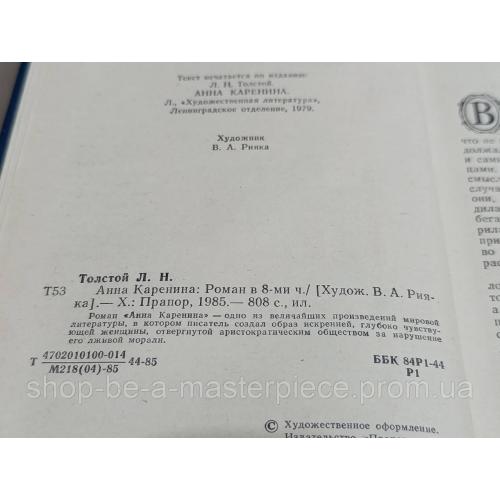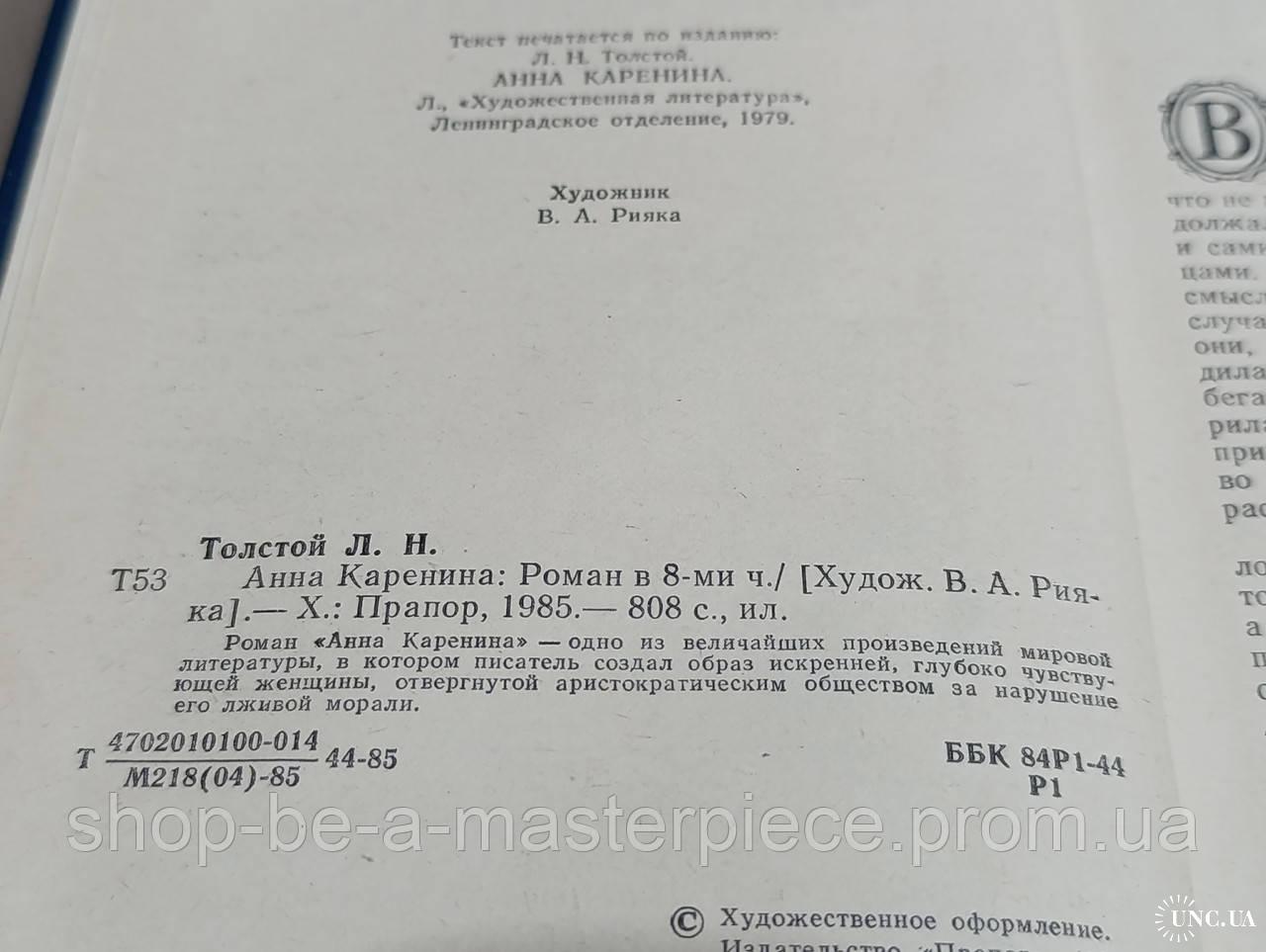Толстой Л. Н. Анна Каренина: Роман в 8-ми ч. 1985 [Худож. В. А. Рия-ка]. — Х.: Прапор, 1985. — 808 с., ил. состояние отличное Роман «Анна Каренина» - одно из величайших произведений мировой литературы, в котором писатель создал образ искренней, глубоко чувствующей женщины, отвергнутой аристократическим обществом за нарушение его лживой морали.Відповіді продавця на ваші питання
