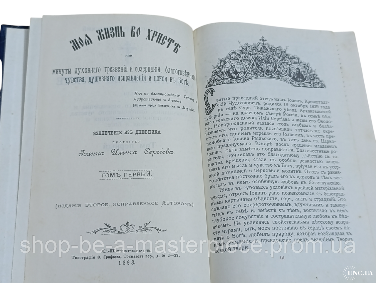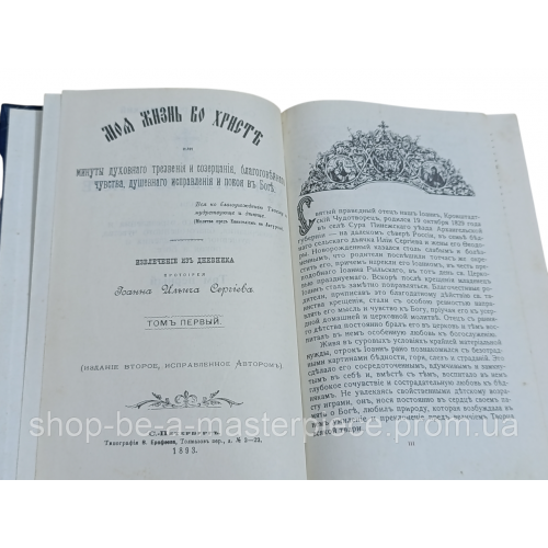 Том 1 Моя жизнь во Христе Св. Иоанн Кронштадский 1893 г. Репринт 1991 г. Состояние хорошее. Все страницы целые. Обложка целая, на боковой части внизу небольшой кусочек 2мм подорван, на фото 2 видно (можно подклеить) На первой странице есть пожелтевшие место На последней странице именная подпись 400 с. Тираж 100 000 Твердая обложка 1991 год; Минск: Дейта-Пресс. 2-е изд. Репринтное воспроизведение издания 1893 года. Книга Св. Иоанна Кронштадского (Сергиев) "Моя жизнь во Христе или Минуты духовного трезвения и созерцания, благоговейного чувства, душевного исправления и покоя в Боге" содержит извлечения из дневника протоиерея Иоанна Ильича Сергиева (Иоанна Кронштадского), представляет собой размышления о жизни верующего человека. Состоит из двух томовВідповіді продавця на ваші питання