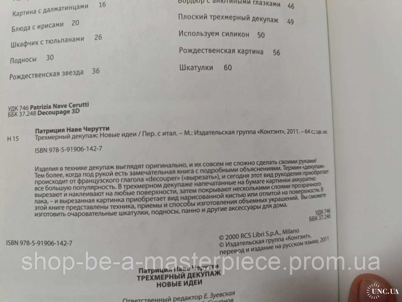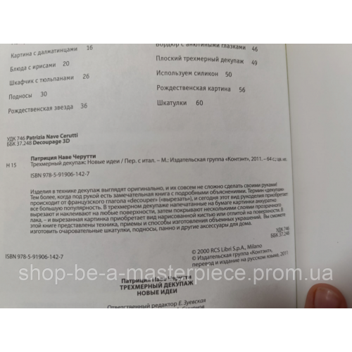 Трехмерный декупаж Черутти Патриция Наве 2011р. Страниц: 64 (Офсет) цветные иллюстрации Обложка мягкая Размеры: 240x165x6 мм Состояние новойВідповіді продавця на ваші питання