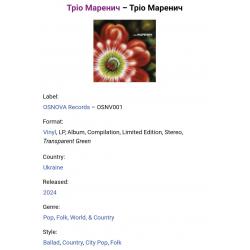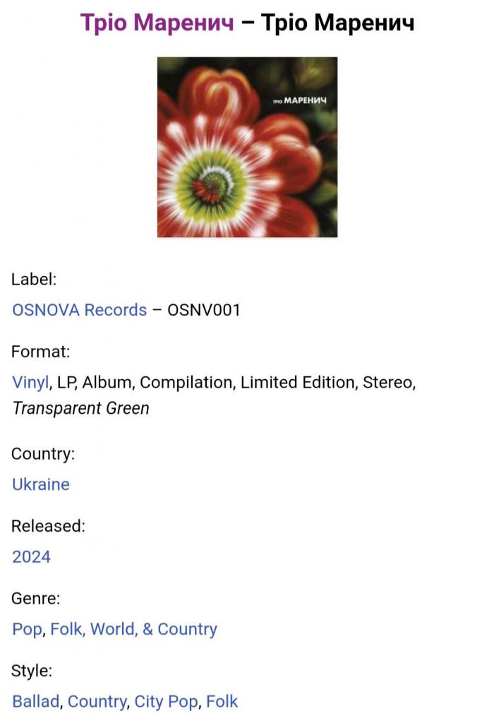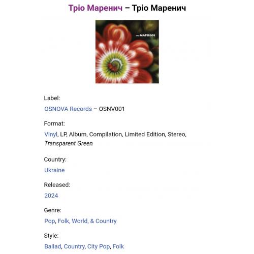 Вінілова платівка. Збірка найкращих хітів, Українського (радянського) фольклорного ансамблю із Луцька, Тріо Маренич, до складу якого входили Валерій Маренич, Антоніна Маренич (Сухорукова) та Світлана Маренич (Сухорукова) - Найкращі Хіти - 1973-80. Випуск фірми (Osnova Records) Ukraine, 2024-ий рік. Кольоровий вініл (Coloured Vinyl). Лімітований тираж (Limited Edition). Видання нове, запаковане. Категорія S/S. Відправка по Україні службами доставки: Нова Пошта, Укр Пошта, Делівері. Також відправляємо посилки за кордон по цілому світу.