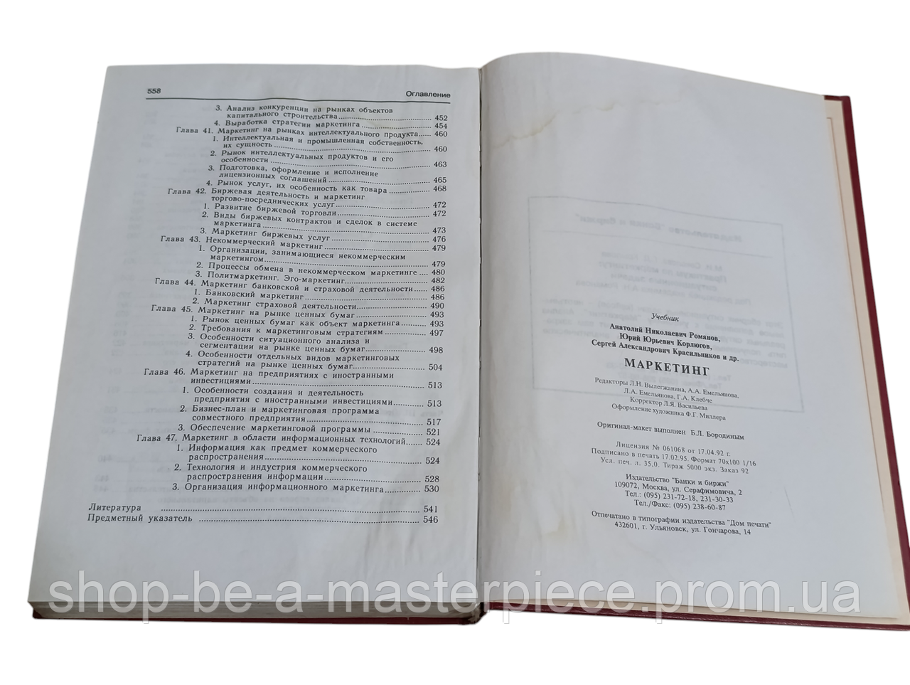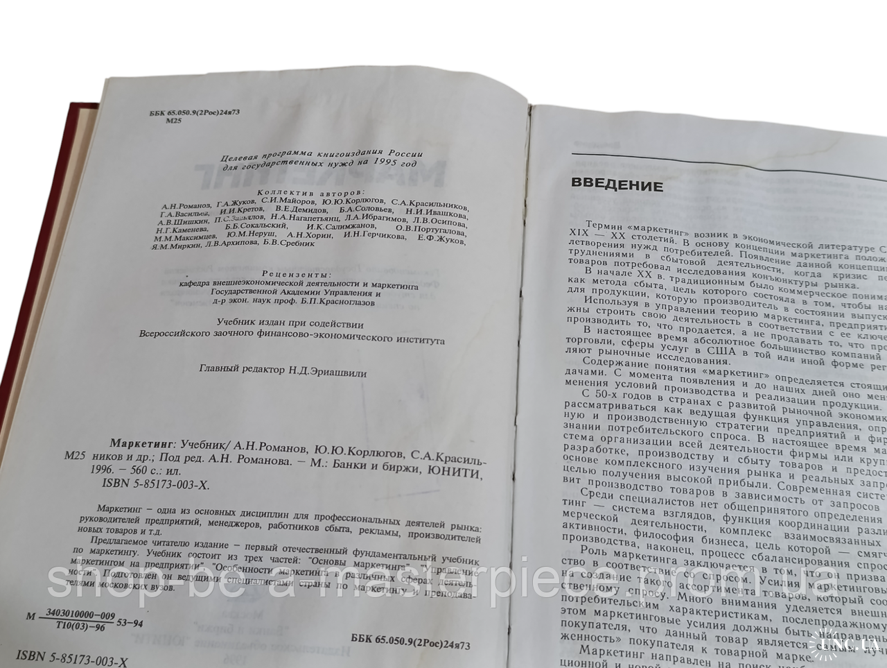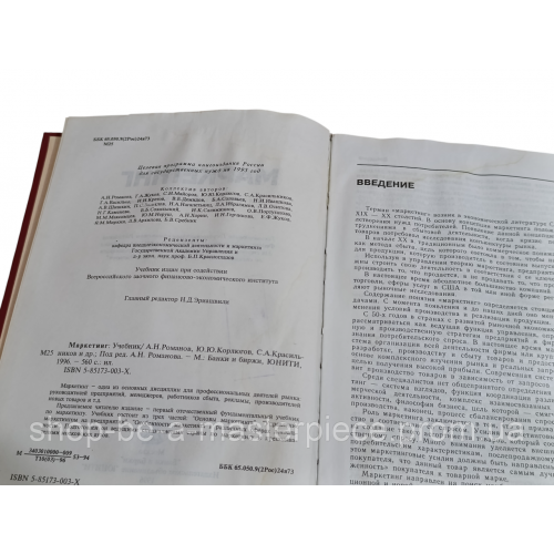 Учебник Маркетинг А.Н. Романов, Ю.Ю. Корлюгов, С.А. Красильников 1996 Под ред. А.Н. Романова. М.: Банки и биржи, ЮНИТИ, 1996. 560 с. Состояние хорошее. Все страницы целые. Обложка не повреждена. Нюанс - книга была затоплена, страницы порваны. Маркетинг одна из основных дисциплин для профессиональных деятелей рынка: руководителей предприятий, менеджеров, работников сбыта, рекламы, производителей новых товаров и т.д. Предлагаемое читателю издание первый отечественный фундаментальный учебник по маркетингу. Учебник состоит из трех частей: "Основы маркетинга", "Управление маркетингом на предприятии", "Особенности маркетинга в различных сферах деятельности".Відповіді продавця на ваші питання